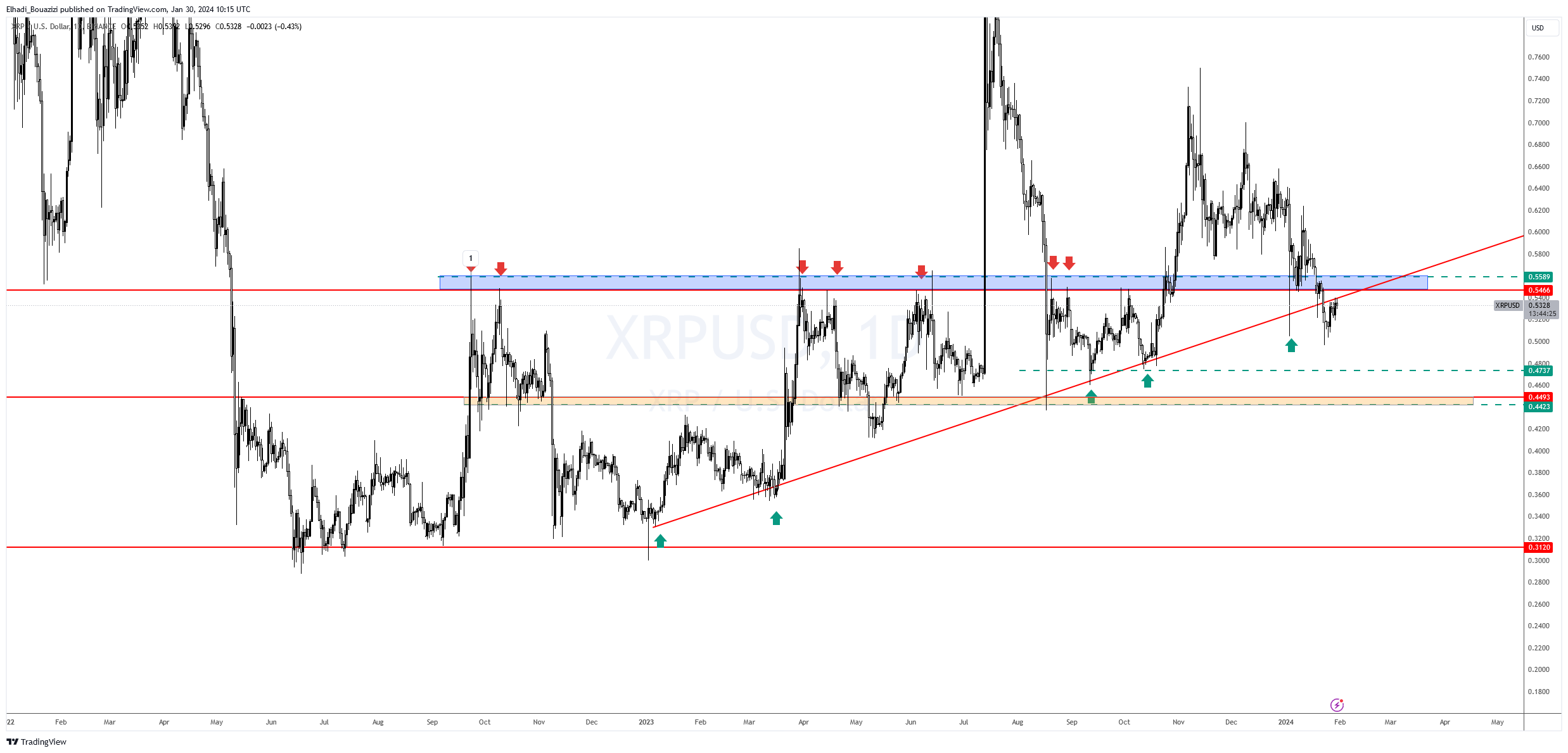 كما أن النظرة الفنية على سعر عملة ريبل XRP  سلبية بعد أن تمكن من كسر حاجر الدعم القوي جدا  عند 0.55 دولار. أيضا تمكن من كسر خط الاتجاه الصاعد الذي بدأ قي تشكل منذ يناير من عام 2023.