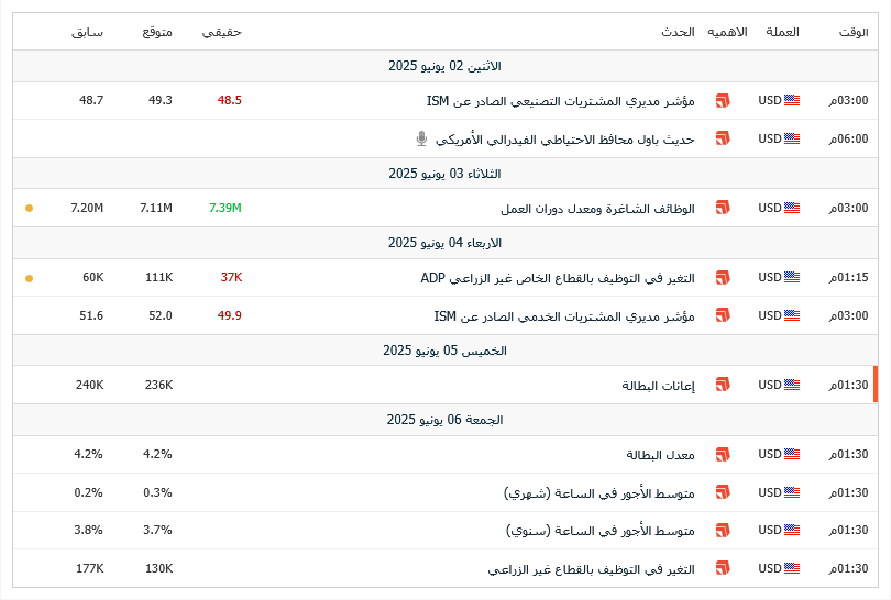 Sponsoredثم جاء مؤشر ISM لقطاع الخدمات ليسجّل 49.9 نقطة، ما يدل على انكماش، في أول قراءة دون عتبة الـ50 منذ عام. يضاف إلى ذلك ما ورد في تقرير "الكتاب البيج" الصادر عن مجلس الاحتياطي الفيدرالي الأميركي، والذي أشار إلى تراجع طفيف في النشاط الاقتصادي، مع بقاء التوقعات العامة في دائرة التشاؤم وعدم اليقين.