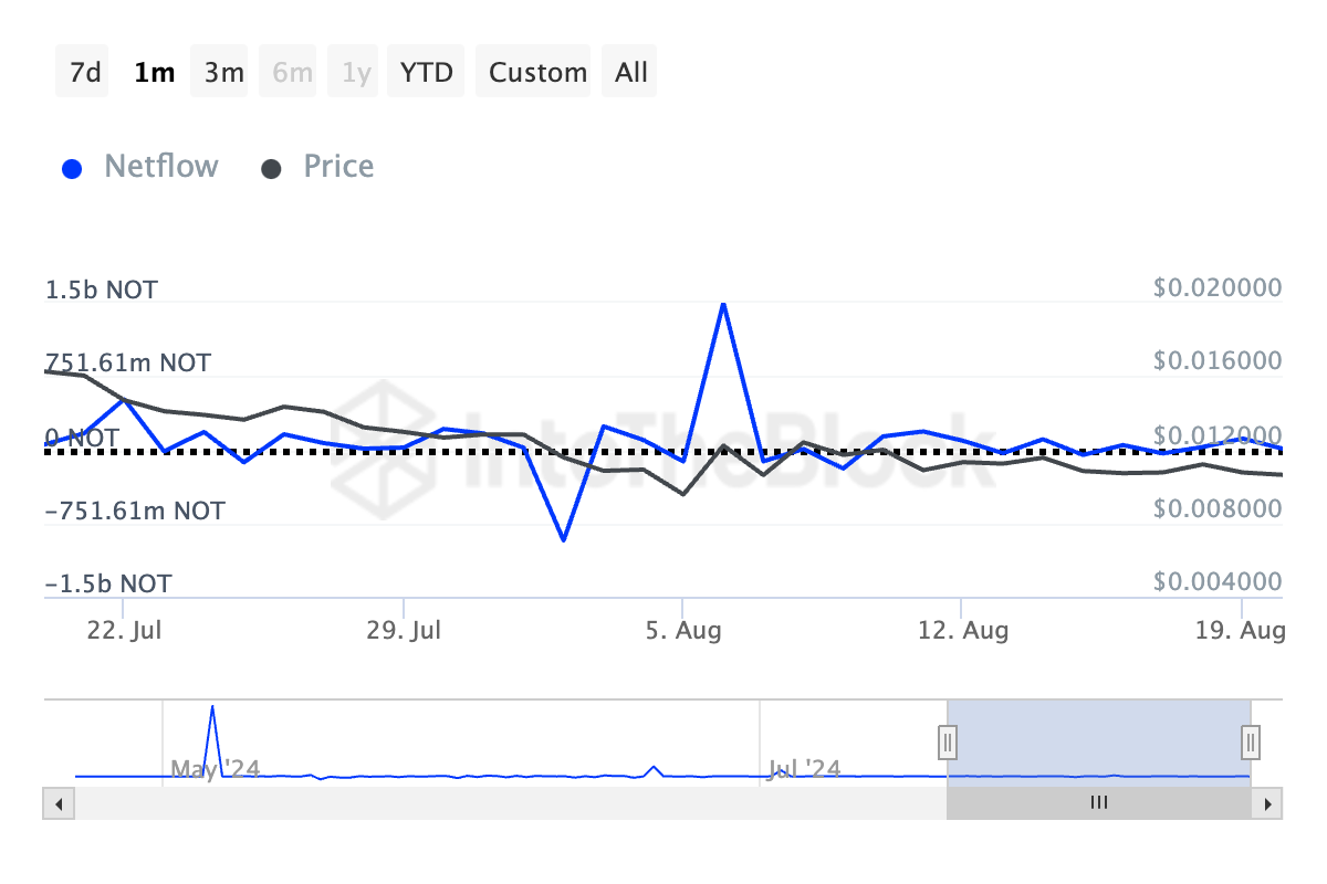 مؤكدًا على زيادة ضغط بيع الحيتان، انخفض صافي تدفق حاملي عملة NOT الكبار بنسبة 98% خلال الـ 30 يومًا الماضية.