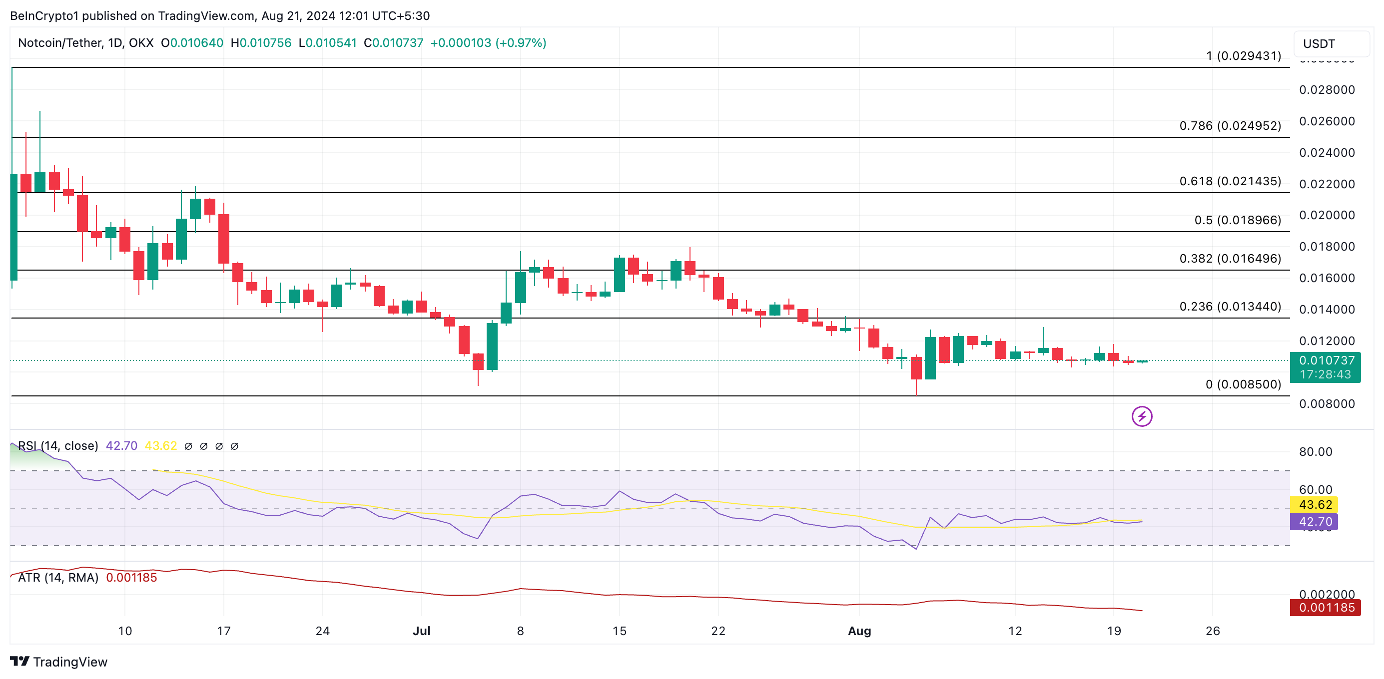 علاوة على ذلك، كان متوسط المدى الحقيقي (ATR) لـعملة NOT، الذي يقيس تقلبات السوق، يتجه نحو الانخفاض منذ 8 أغسطس، مما يعزز مرحلة التوطيد. يشير ATR الهابط إلى تقلبات سوقية مخفضة، مما يشير إلى أن الأصل أقل عرضة لتقلبات الأسعار. حتى الآن، ATR لـعملة NOT هو 0,0011.
