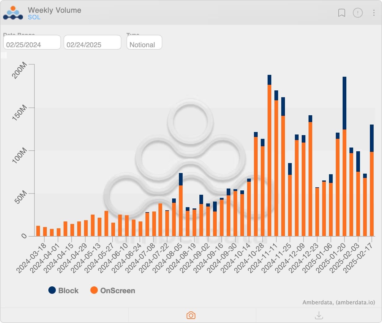 عقود خيارات سولانا SOL: الحجم الأسبوعي في التداولات الكبيرة وتداولات خارج البوصة (من أسعار الشاشة). (Amberdata/Deribit)