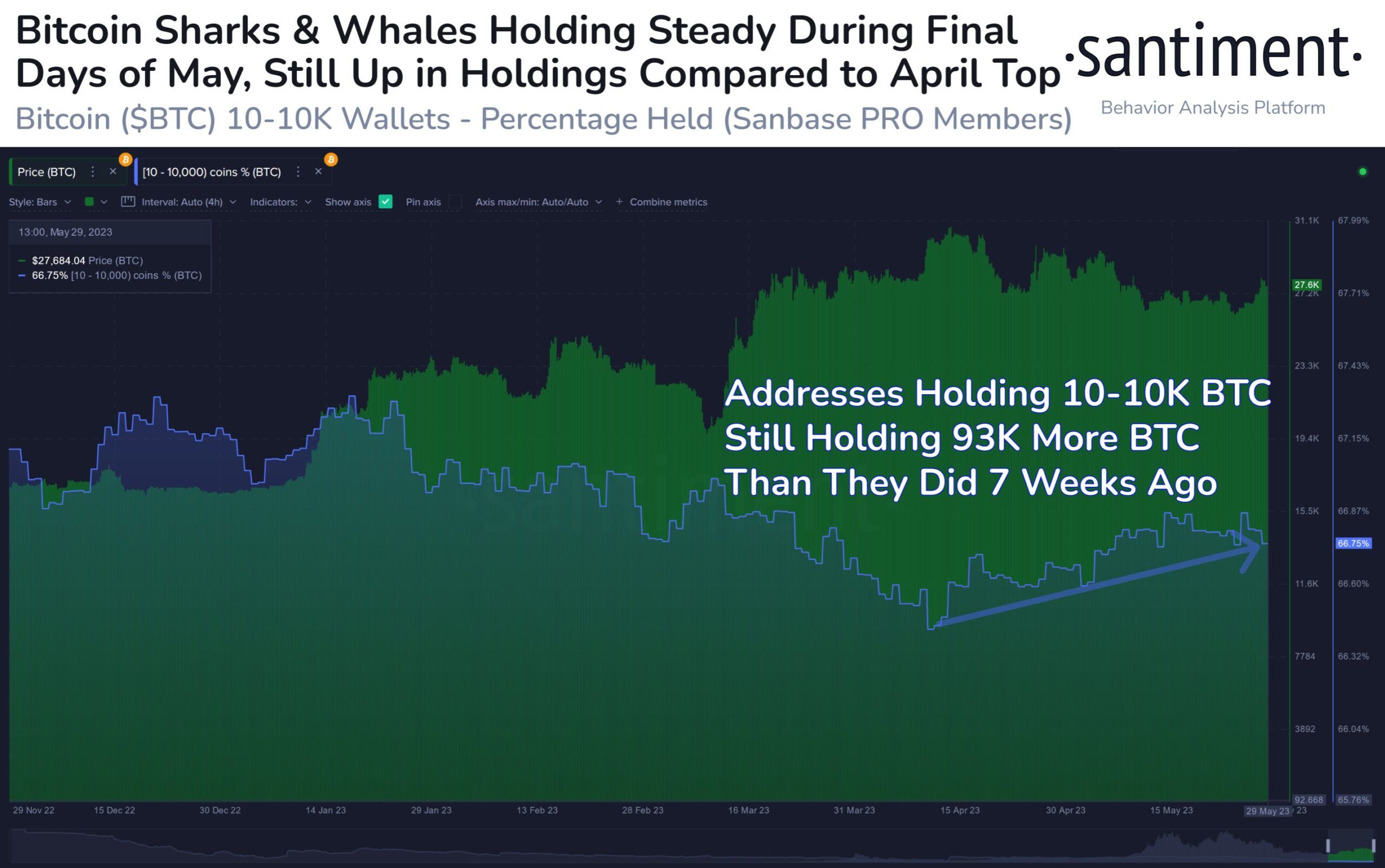 تحديدًا، كانت المحافظ المشفرة التي تحتوي على 10 إلى 10,000 BTC ثابتة خلال الأيام الأخيرة من شهر مايو. ولكن حيازتهم ازدادت بمقدار 93000 BTC خلال السبعة أسابيع الماضية. وفقًا للبيانات التي قدمتها منصة تحليل العملات المشفرة Santiment في 29 مايو.