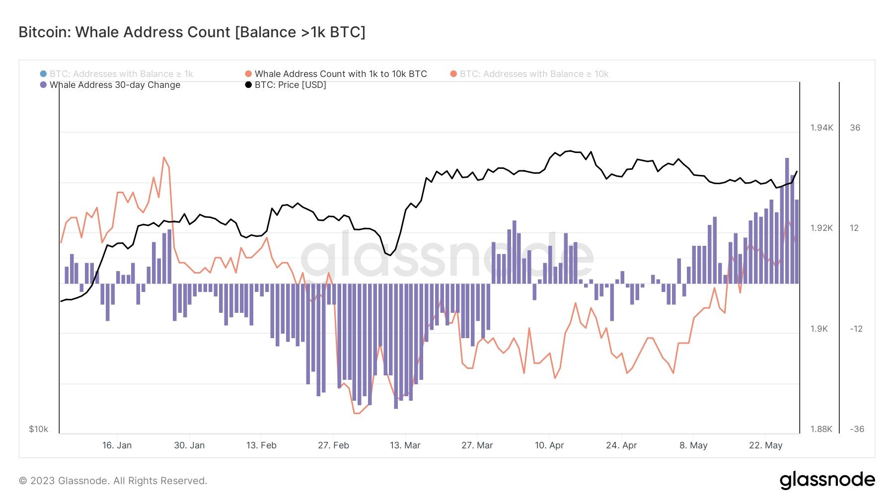 تشير البيانات Glassnode إلى زيادة عدد عناوين الحيتان. والتي تعرف بأنها العناوين التي تحتوي على أكثر من 1000 BTC. خلال النصف الثاني من شهر مايو، حيث وصلت إلى ذروتها خلال عطلة نهاية الأسبوع.