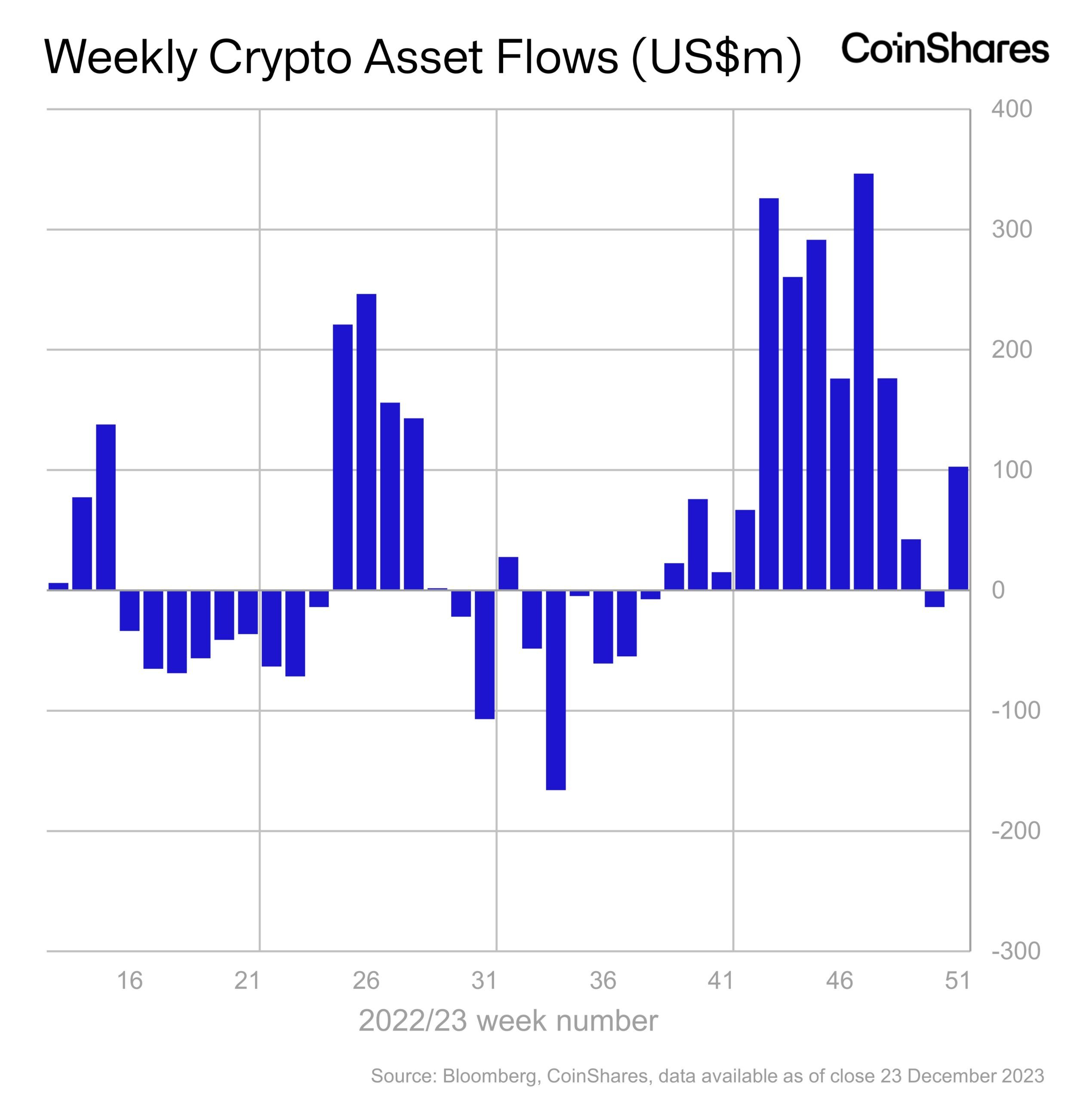 أظهر البيانات الأخير من شركة كوينشيرز CoinShares أن منتجات الاستثمار المرتبطة بالعملات الرقمية المشفرة تدفقات إيجابية بقيمة 103 مليون دولار في الأسبوع الماضي، مما رفع إجمالي التدفقات منذ بداية العام إلى ما يقرب من 2 مليار دولار. يأتي ذلك التدفقات السلبيات المفاجئة التي حدث في الأسبوع الماضي. التي أنهت سلسلة من 11 أسبوعًا متتاليًا من التدفقات الإيجابية.