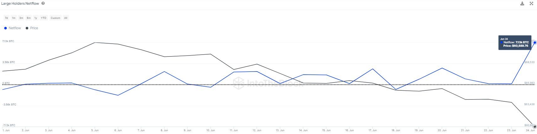 أظهرت بيانات منصة "IntoTheBlock" أن المحافظ الكبيرة على شبكة البيتكوين شهدت تدفقات مالية صافية كبيرة في الفترة الأخيرة، حيث قام كبار المستثمرين، الذين يمتلكون 0.1% أو أكثر من إجمالي المعروض المتداول من البيتكوين، بشراء 7130 بيتكوين خلال فترة الانخفاض الأخيرة، بقيمة تقارب 439 مليون دولار.