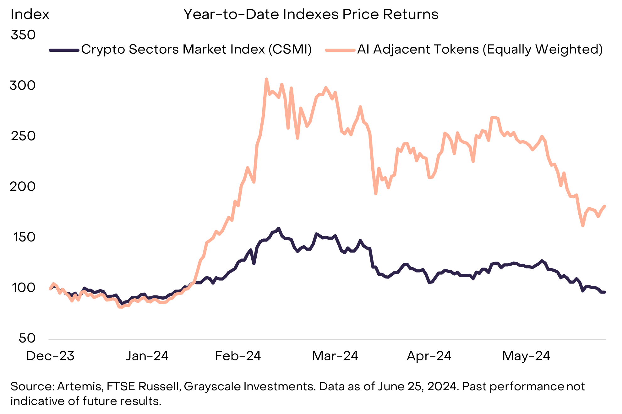 تتوقع غرايسكيل أن يظل التداخل بين الذكاء الاصطناعي والبلوكتشين محورياً مع تطور السوق. لقد أدى التآزر بين الذكاء الاصطناعي والعملات المشفرة إلى تغذية الابتكار وتحسين أداء السوق بشكل كبير للرموز المجاورة للذكاء الاصطناعي. لقد ارتفعت هذه الرموز بنسبة 80% منذ بداية العام، بما يتناقض بشكل صارخ مع الانخفاض المتواضع في السوق الأوسع للعملات المشفرة.