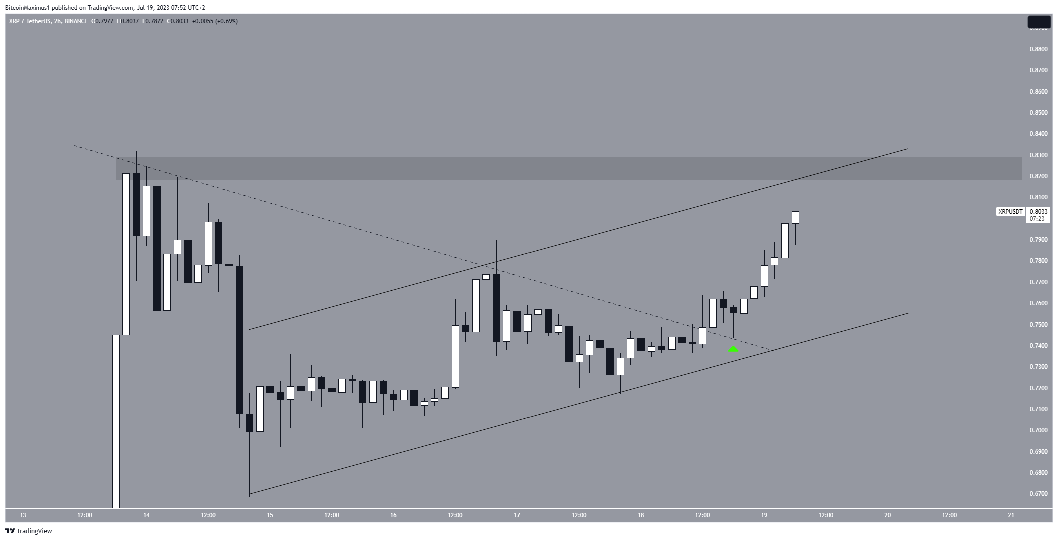 وبعد الاختراق، تحققت عملة XRP من صحة الخط كدعم (الرمز الأخضر) ليتم تسريع معدل الزيادة