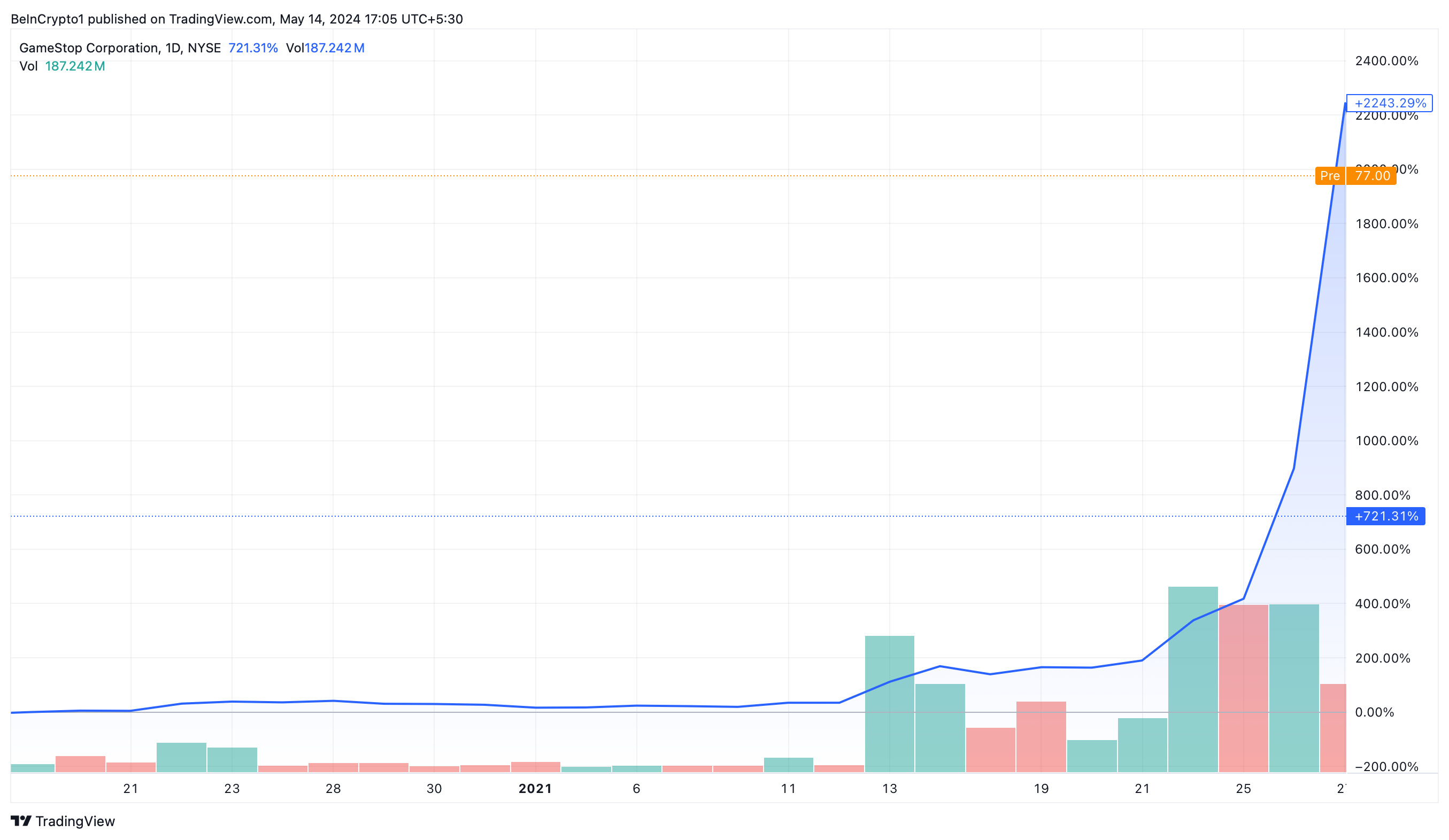 ومع ذلك، اتخذ السرد منعطفا حادا عندما ارتفعت أسهم GME، التي بلغت قيمتها في البداية حوالي 5.16 دولارا، لتتجاوز 490 دولارا في عام 2021. كان هذا التضخم في الأسعار مدفوعا بشكل أساسي من قبل المستخدمين من r / WallStreetBets subreddit.