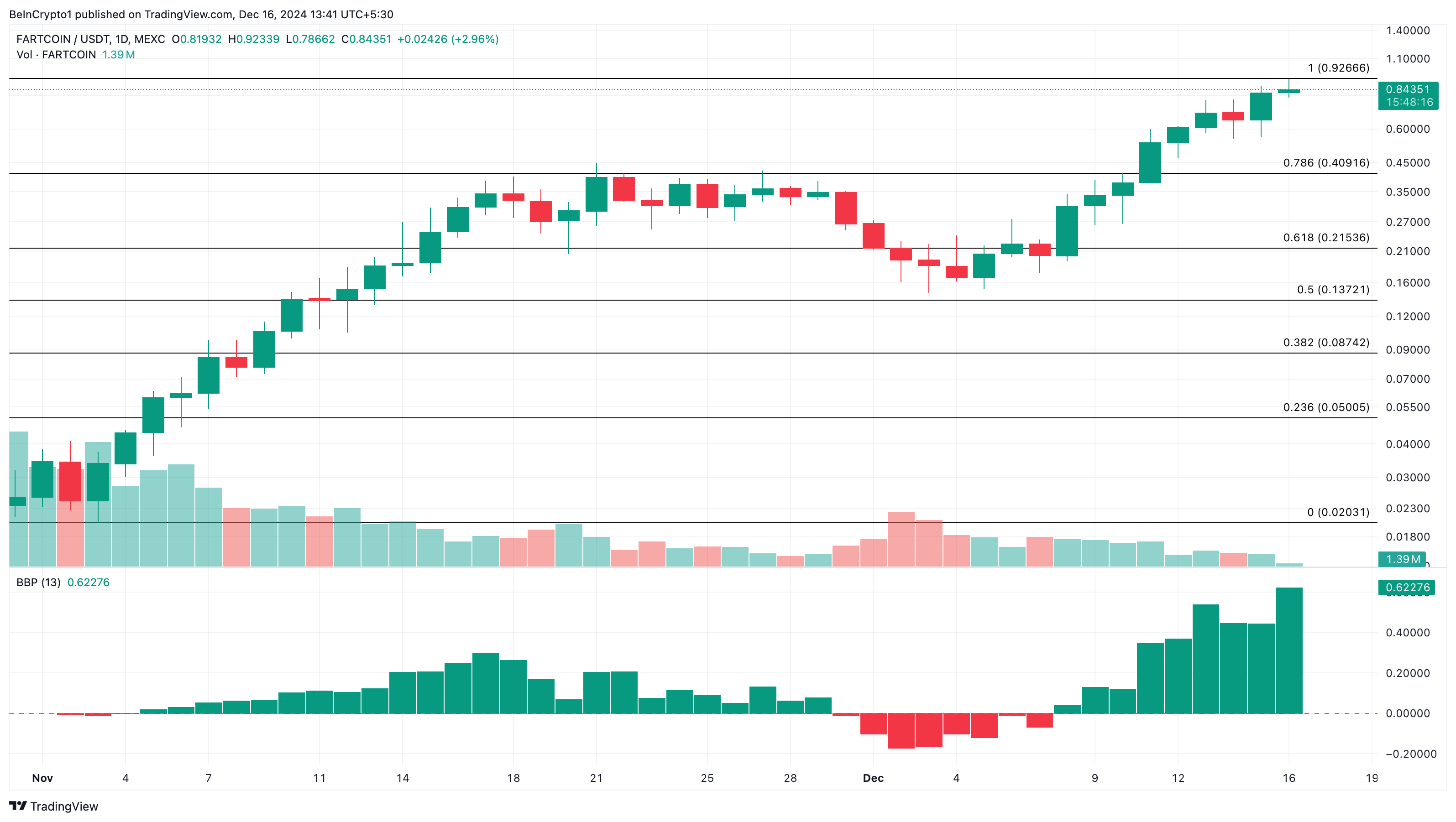 تقترب فارتكوين (FARTCOIN)، العملة الميمية المستندة إلى سولانا والمستوحاة من منشورات الوكيل الذكي تروث تيرمينال الفيروسية، من قيمة سوقية تبلغ مليار دولار. خلال الأيام السبعة الماضية، ارتفع سعرها بنسبة 180%، مما دفعها إلى 0,84 دولار في وقت الكتابة.