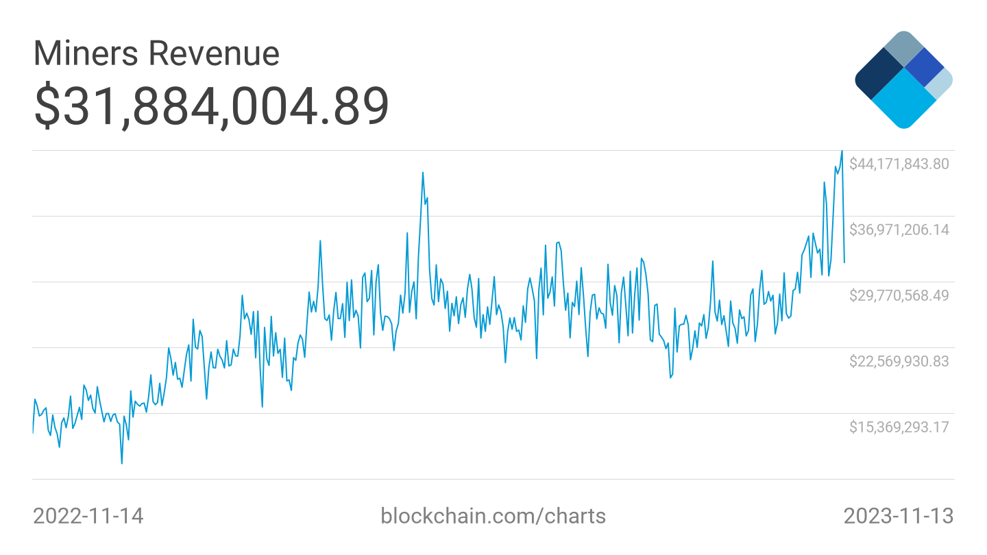 يبدو أن ارتفاع أسعار البيتكوين في الأسابيع الماضية قد ظهرت ثمارها أخيرا عند المعدّنين. ففي 12 نوفمبر حقق منقبو البيتكوين أكثر من 44 مليون دولار في الإيرادات اليومية من مكافآت الكتل ورسوم التحويل، وهو مستوى قياسي سنوي لعام 2023. آخر مرة شهدنا فيها هذا الارتفاع في إيرادات التعدين كان في أبريل 2022. حسب ما بيانات منصة blockchain.com.