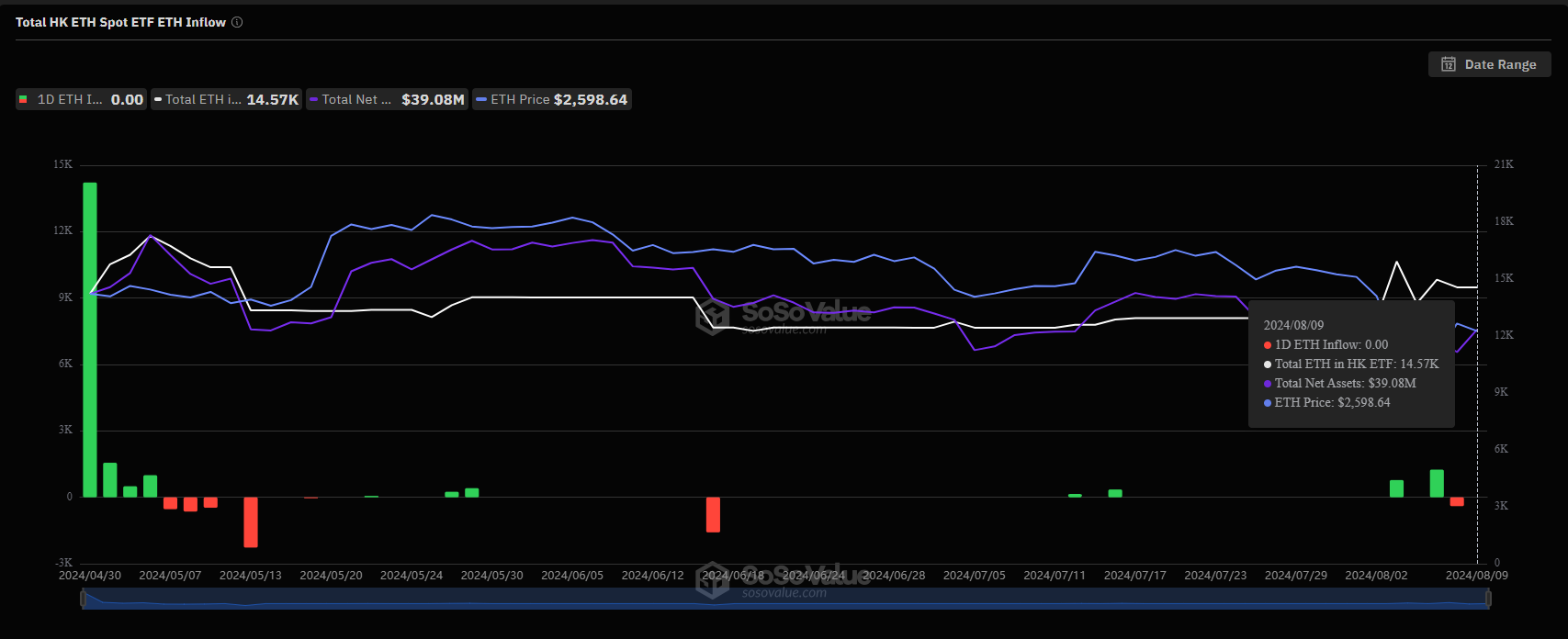 شهدت صناديق الاستثمار المتداولة المرتبطة بإيثريوم في هونغ كونغ تقلبات مماثلة. في 8 أغسطس، سجلت هذه الصناديق تدفقاً خارجياً بمقدار 399,09 ETH، تلاه تدفق داخلي بمقدار 1,250 ETH في 7 أغسطس. ومثل نظيراتها المرتبطة ببيتكوين، انخفضت أيضاً إجمالي الأصول الصافية لهذه الصناديق من ذروتها.