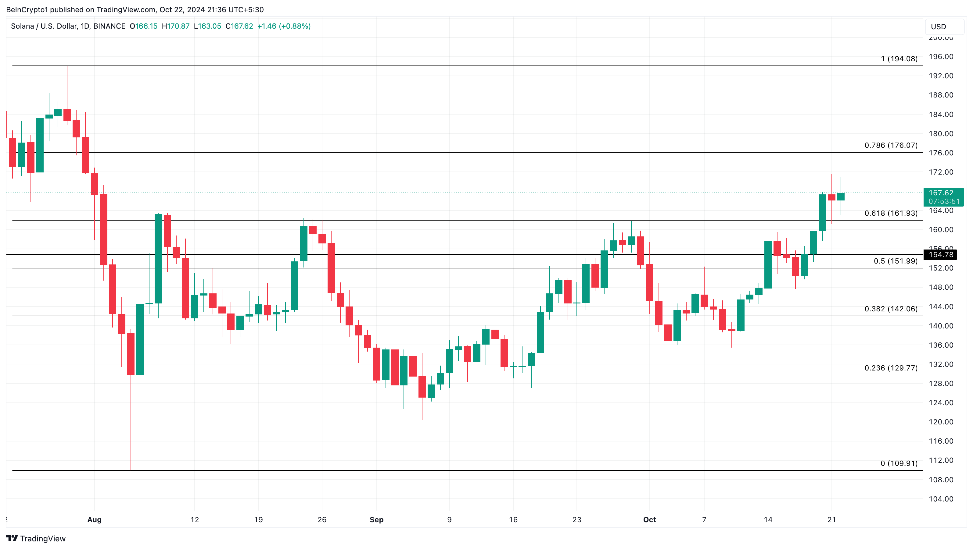 Sponsoredيبدو أيضًا أن مستويات تصحيح فيبوناتشي تدعم هذا التحرك. استنادًا إلى مخطط سعر سولانا أدناه، إذا زادت ضغوط الشراء، قد تقفز العملة البديلة إلى مستوى تصحيح فيبوناتشي 78,6%. في هذا السيناريو، قد يصل الرمز إلى 176,07$، مما ينبئ بارتفاع آخر نحو 194,08$.