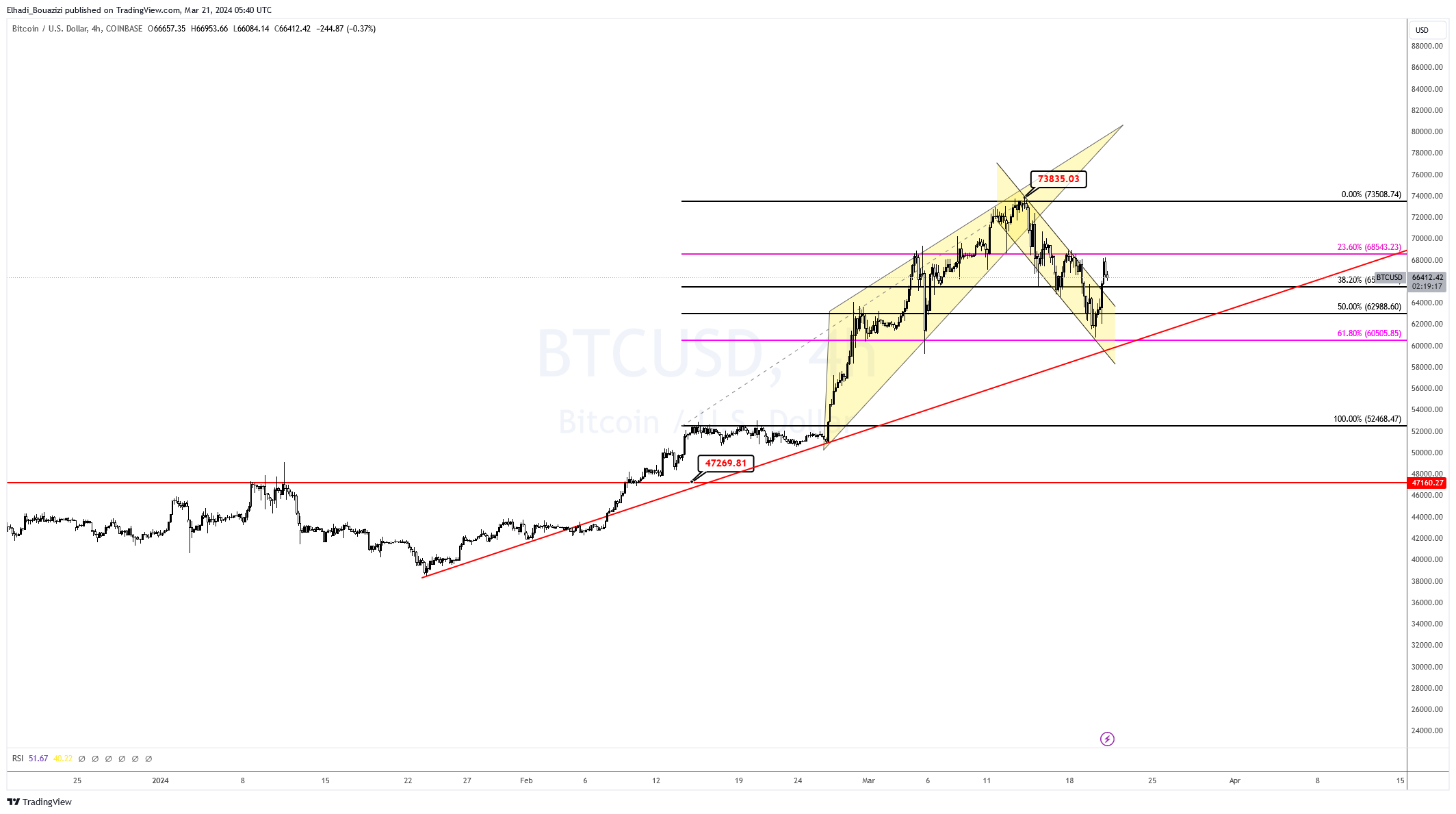 الإغلاق فوق مستوى 23.6% يعني استمرار موجة الصعود نحو 73.500 دولار. بالنسبة للهبوط تحت مستوى 60,000 دولار يجب كسر خط الاتجاه الصاعد و مستوى تصحيح فيبوناتشي 61.8%.