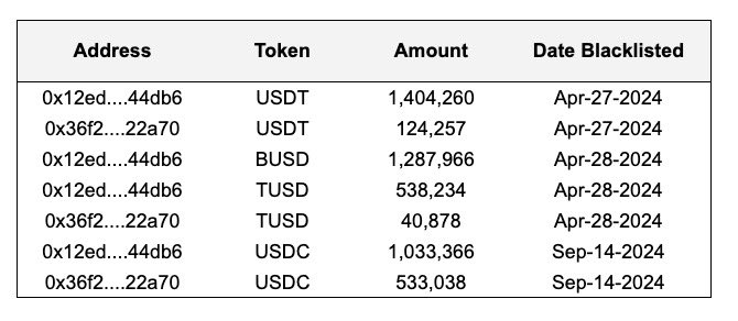 أفاد زاك إكس بي تي (ZachXBT) أن مُصدري العملات المستقرة تيثر وسيركل وباكسوس وتكتيريكس قد أدرجوا عنوانين يحتويان على 4,96 مليون دولار في الأصول ضمن القائمة السوداء. ومع ذلك، لا تزال هذه المحافظ تحتفظ بـ 720 ألف دولار في داي و313 ألف دولار في إيثريوم، والتي لم يتم تجميدها.