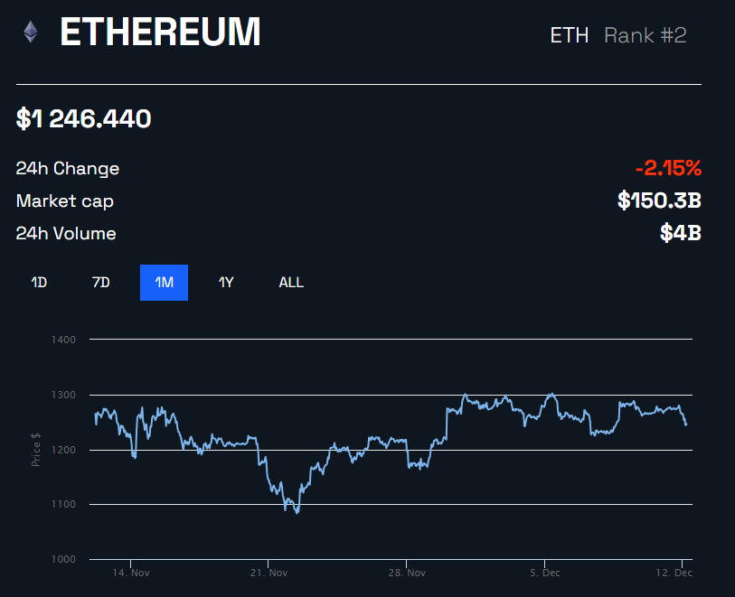 ونتيجة لما حدث فقد تراجع الأصل المشفر خلال جلسة التداول الآسيوية صباح يوم الأثنين حيث انخفض تداول ايثر بنسبة 2.2% خلال هذا اليوم عند 1،244 دولار وقت كتابة هذا التقرير وفقاً لمنصة CoinGecko.
