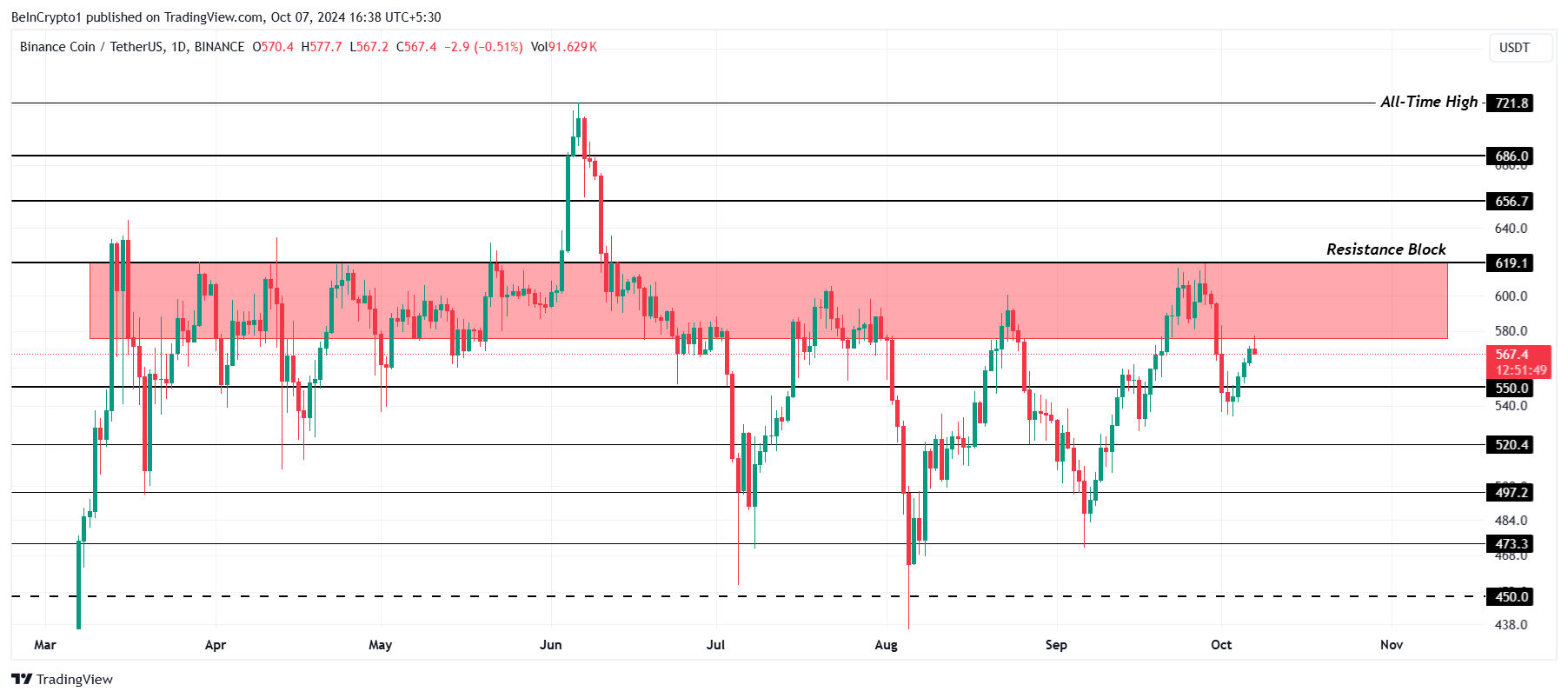 لقد كافح سعر BNB لاختراق كتلة مقاومة أبقت العملة البديلة مكبوتة خلال الأشهر السبعة الماضية. تتراوح المقاومة الحالية من 575 دولار إلى 619 دولار، وعلى الرغم من أن عملة بينانس أظهرت إشارات صعودية مؤخرًا، لا يزال من غير المؤكد إذا كانت العملة قادرة على اختراق هذه الحاجز.