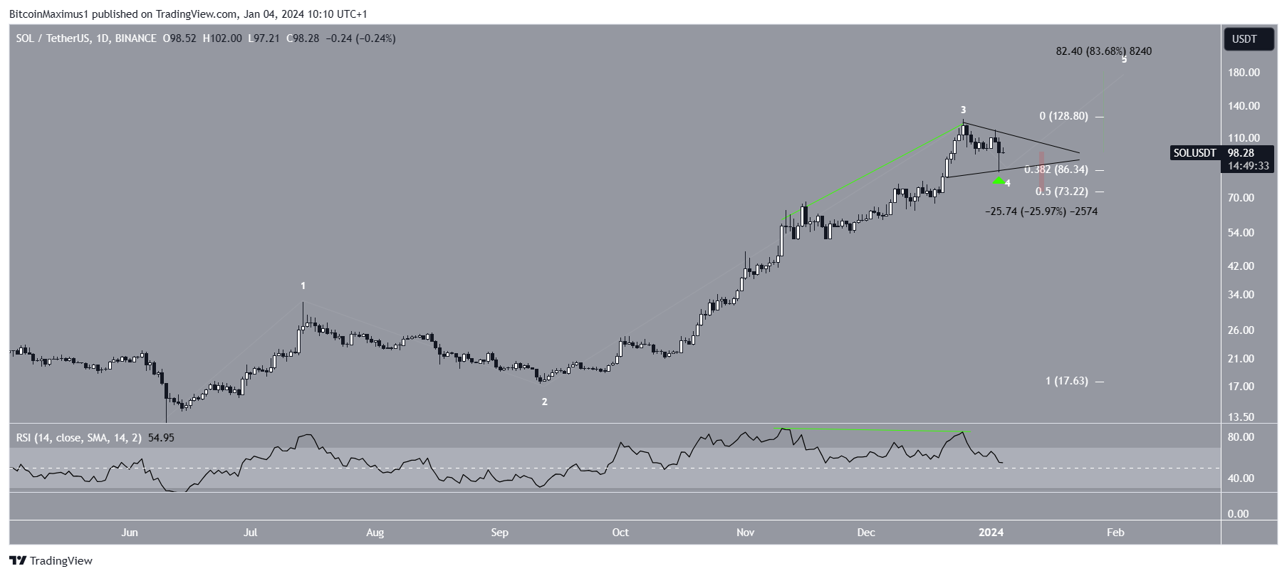 كما يشير العدد الموجي الأكثر ترجيحًا إلى أن سعر سولانا SOL يقع في الموجة الرابعة من حركة صعودية مكونة من خمس موجات (أبيض). ويدعم مؤشر القوة النسبية اليومي هذا الاحتمال حيث تم دمج أعلى مستوى عند 126 دولارًا مع تباعد هبوطي في مؤشر القوة النسبية (الأخضر).