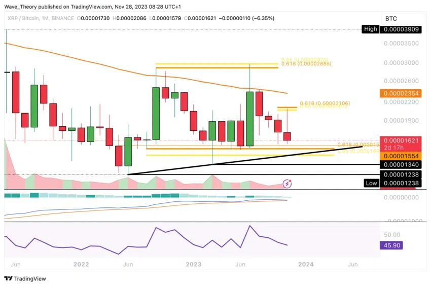 في الشهر الأخير، واجهت الريبل رفضًا هبوطيًا عند مقاومة النسبة الذهبية بالقرب من 0.000021 بيتكوين. إذا تمكنت الريبل من تجاوز مستوى المقاومة هذا، فإن العقبة المهمة التالية للسعر ستكون المتوسط المتحرك لـ 50 شهرًا عند حوالي 0.0000235 بيتكوين.
