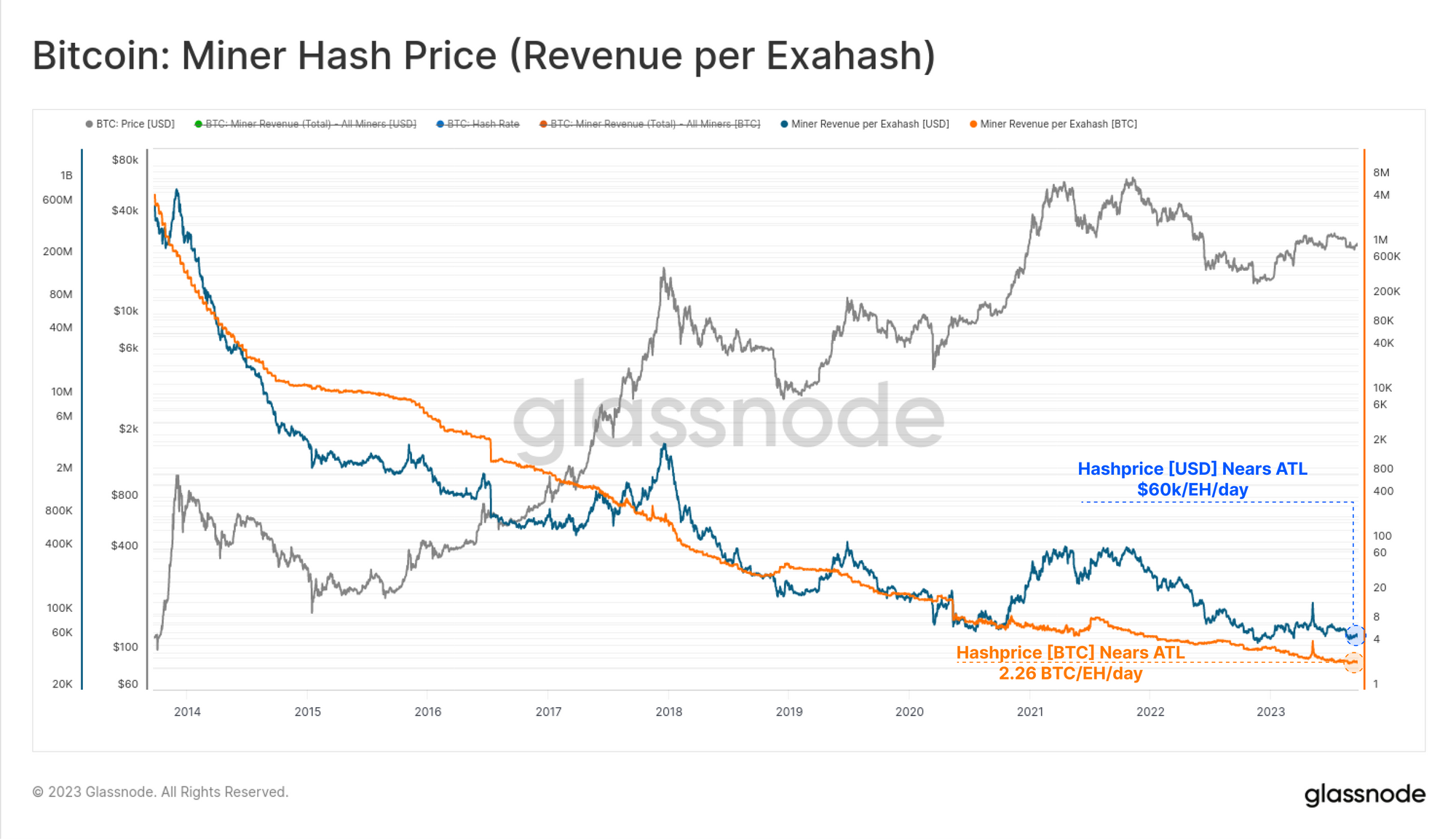 نتيجة لارتفاع المنافسة بين المعدّنين إلى مستوى جديد. انخفض معدل "عائد التعدين لكل هاش revenue per hash " إلى أدنى مستوى له على الإطلاق.