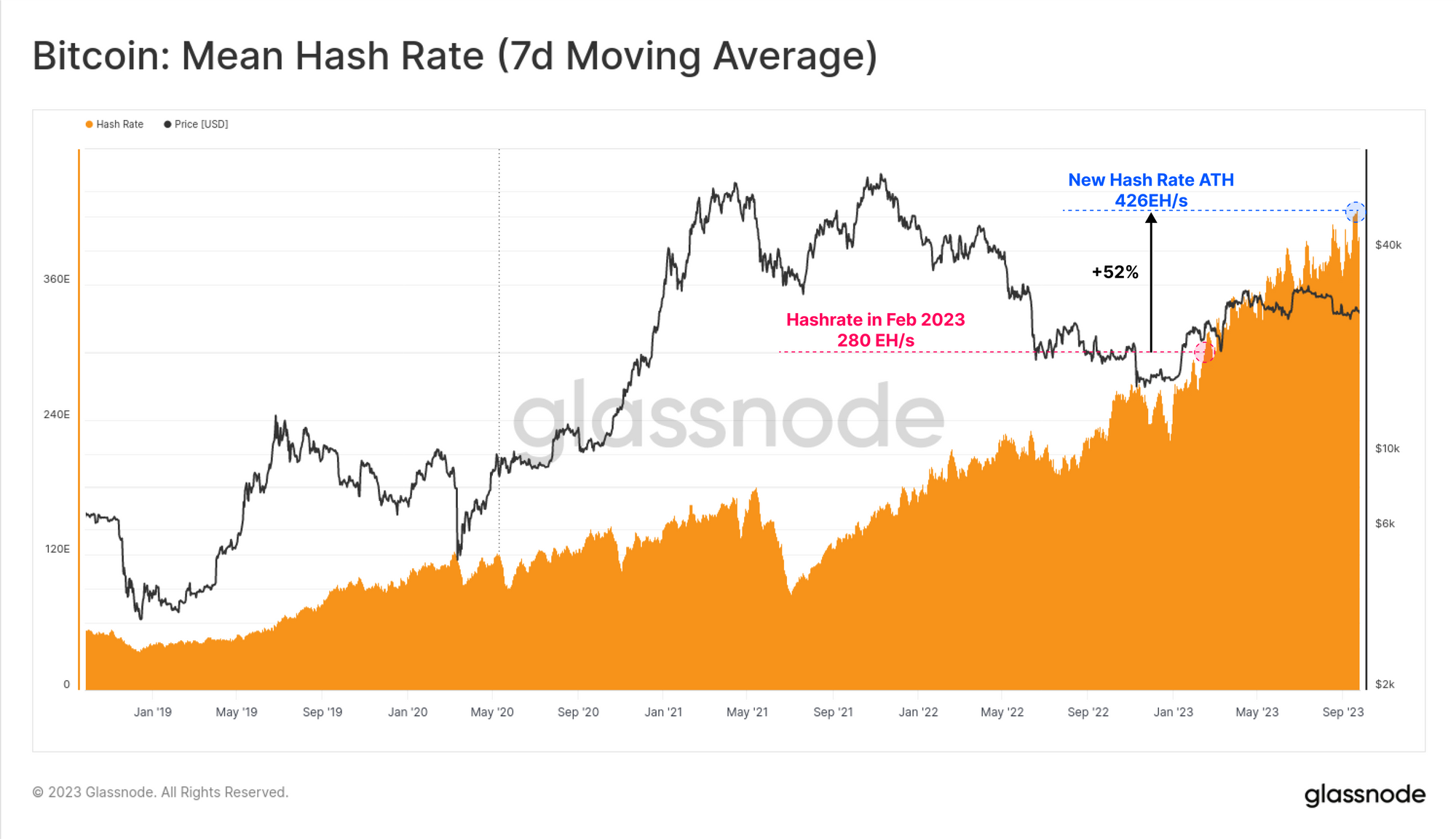 في الرسم البياني المرفق نلاحظ ارتفاع معدل هاش تعدين البيتكوين لمدة 7 أيام بنسبة 52% منذ فبراير وسجلت أعلى مستوى على الإطلاق.