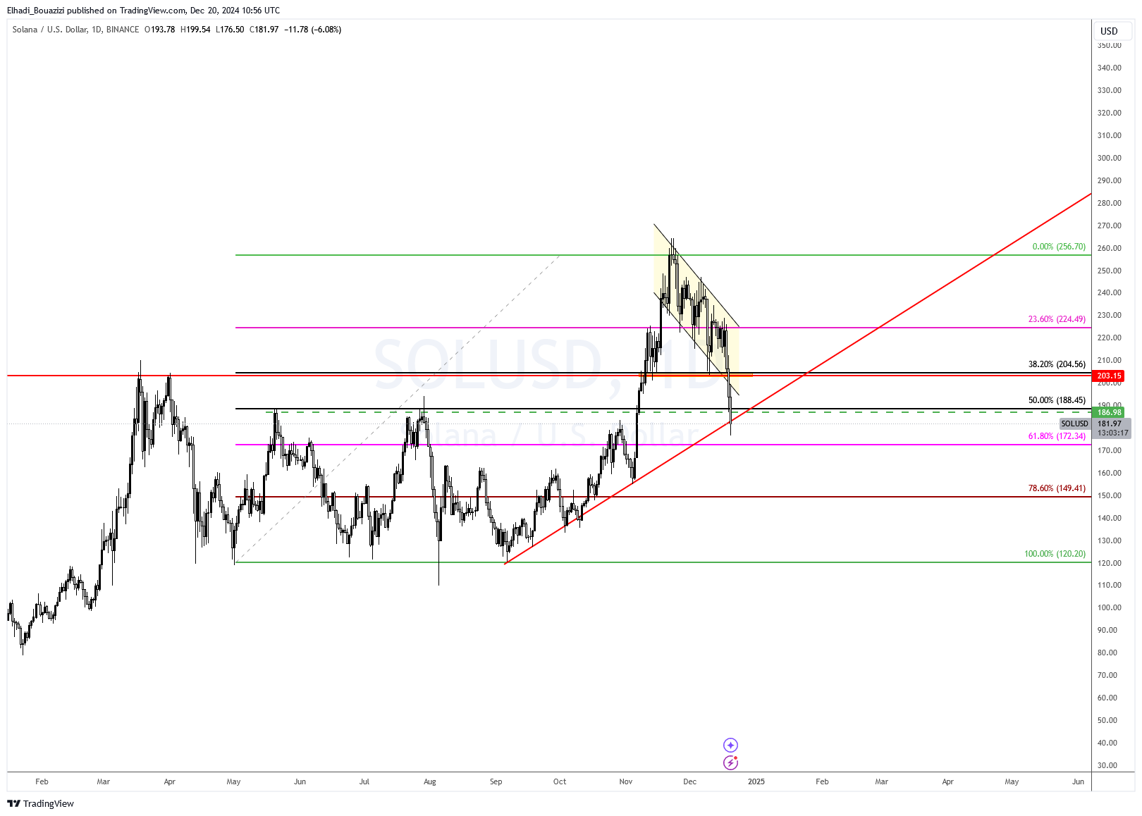كما كسر السعر مستوى الدعم القوي لمستوى فيبوناتشي 38.2% عند السعر 200 دولار، و الذي يتطابق مع القمة السنوية السابقة لعام 2024.