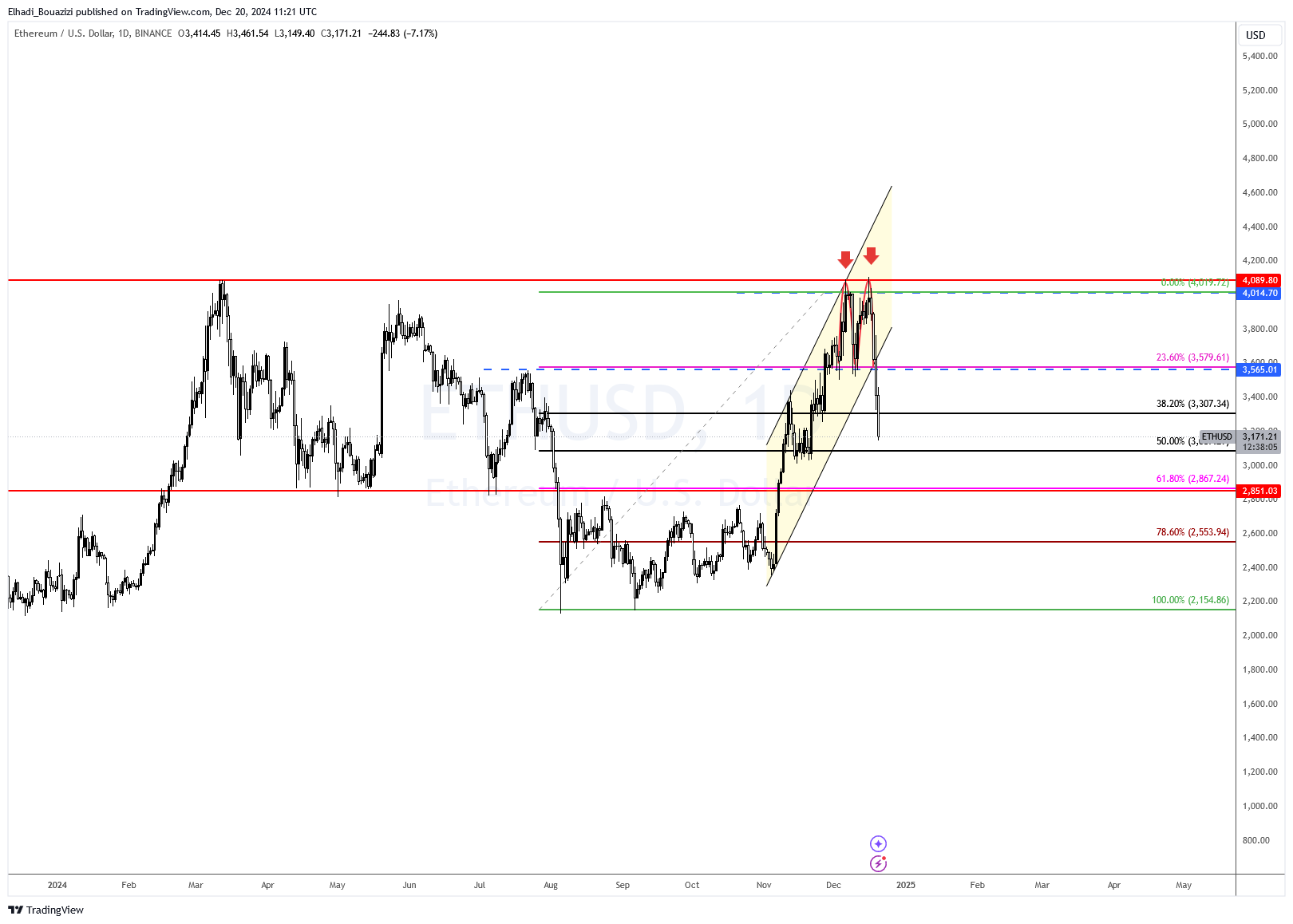 • إيثيريوم ETH: كسر خط العنق عند 3580$. دعم رئيسي عند 2870$ بتصحيح فيبوناتشي 61.8%.