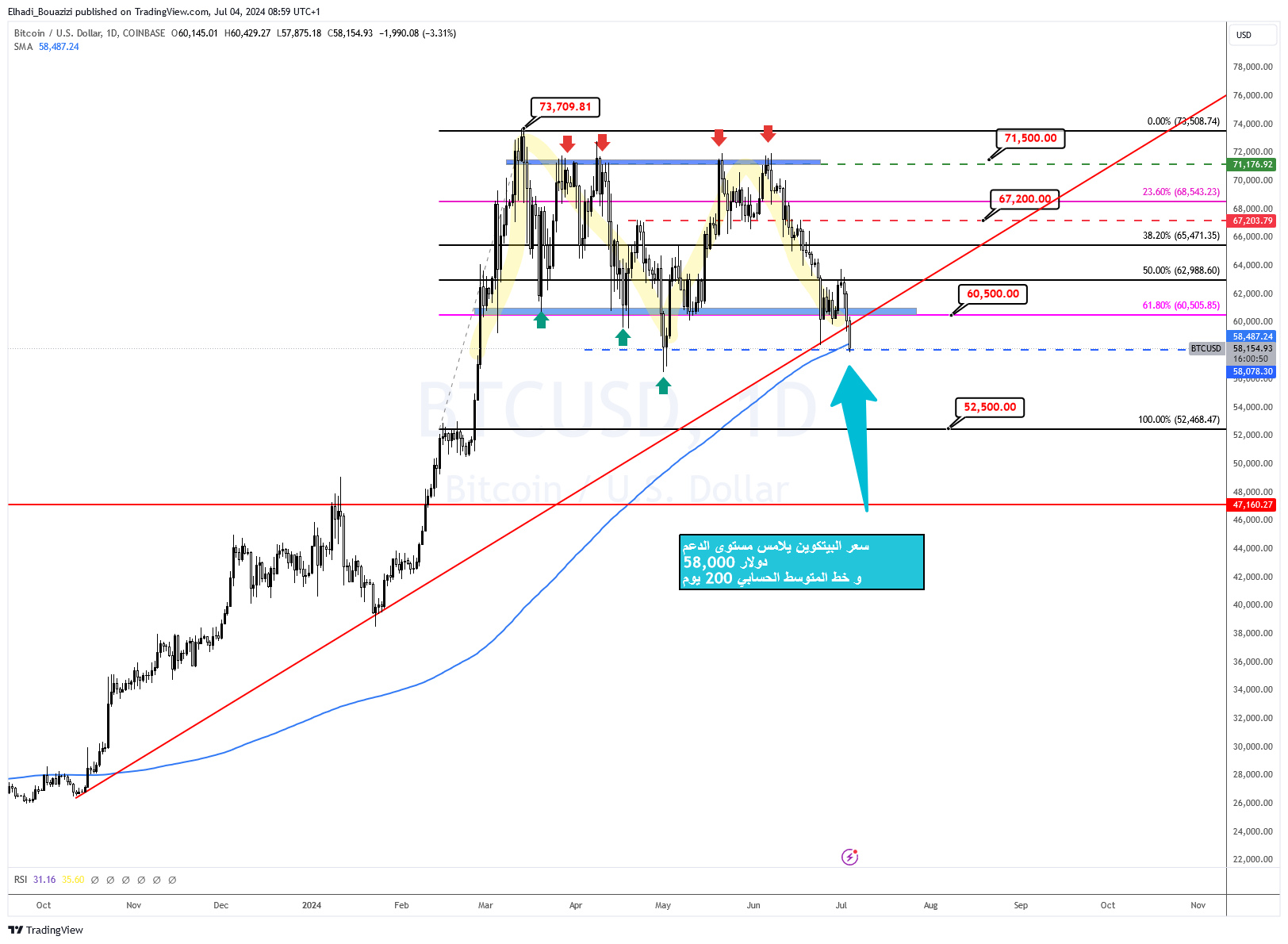سعر بيتكوين BTC تمكن من الهبوط تحت مستوى الدعم المحوري 60,500 دولار و أيضا خط الاتجاه الهابط. و لكن لتأكيد الهبوط يجب أولا أن يحدث إغلاق اليوم تحت هذه المستويات.