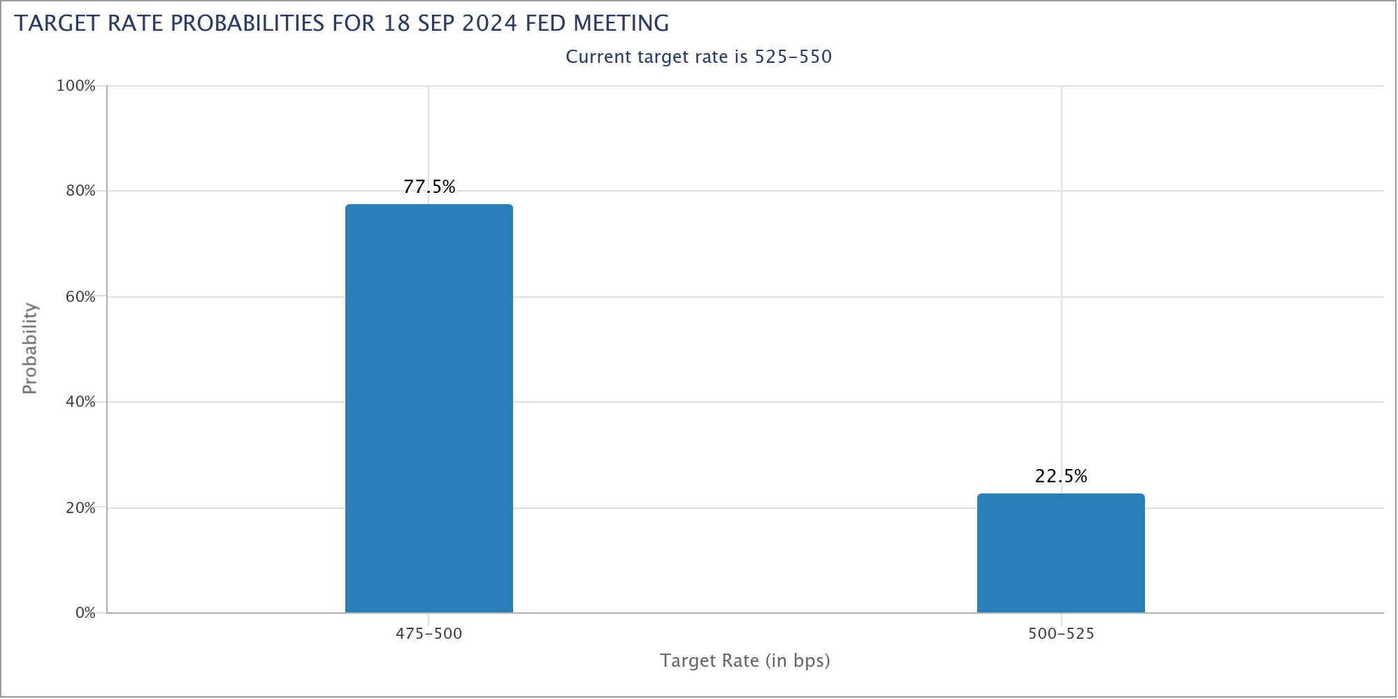 في بورصة شيكاغو التجارية (CME)، تسعّر الأسواق الآن أكثر من 50 نقطة أساس (bps) خفضًا في سعر الفائدة بحلول سبتمبر و125 نقطة أساس بحلول ديسمبر. في وقت سابق، كانت الأسواق تراهن على خفض 25 نقطة أساس في سبتمبر.