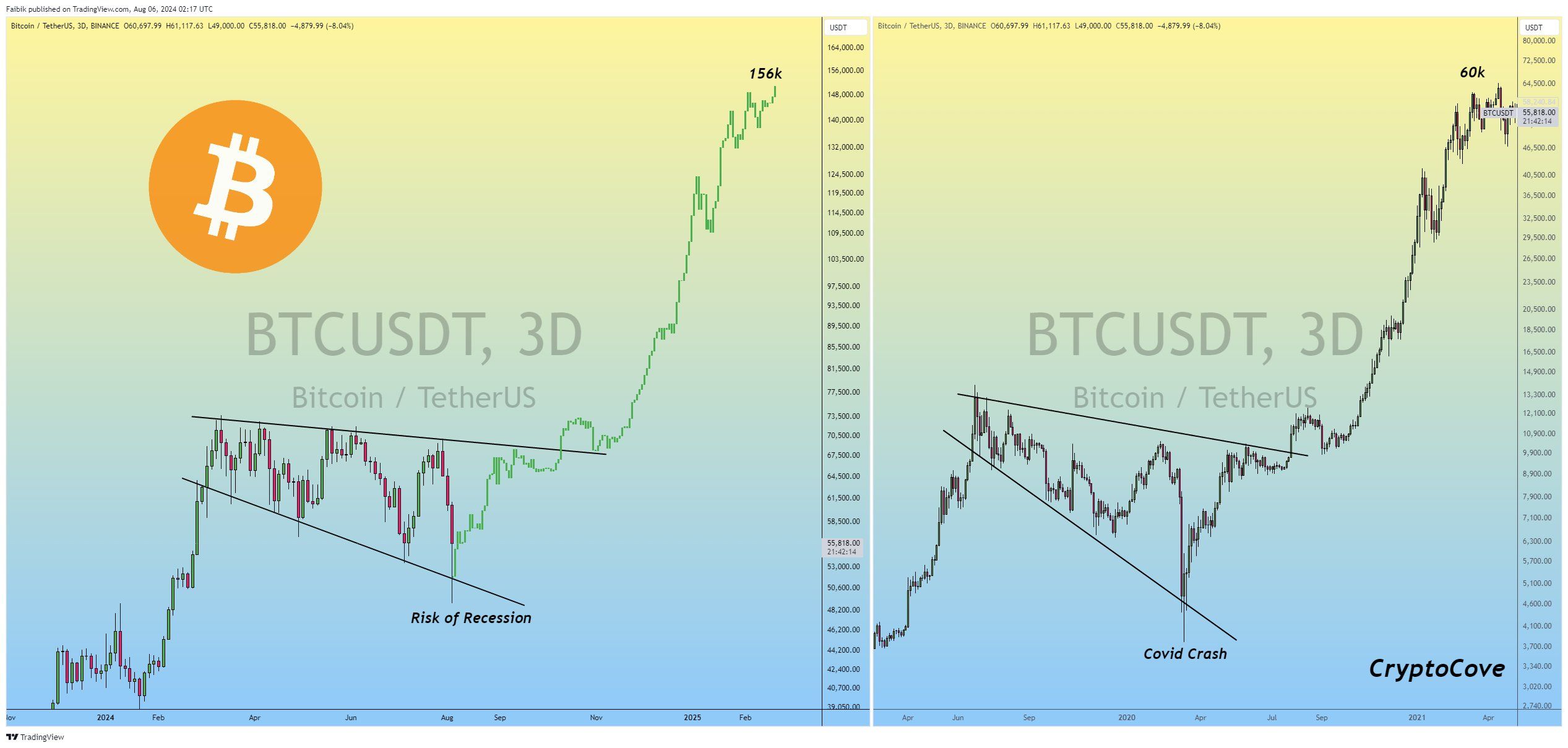 محلل العملات الرقمية Captain Faibik شارك في تغريدة في على X الرسم البياني أدناه ليوضح التشابه بين حركة سعر البيتكوين في 2020 بعد انهيار كوفيد و الانهيار الحالي.