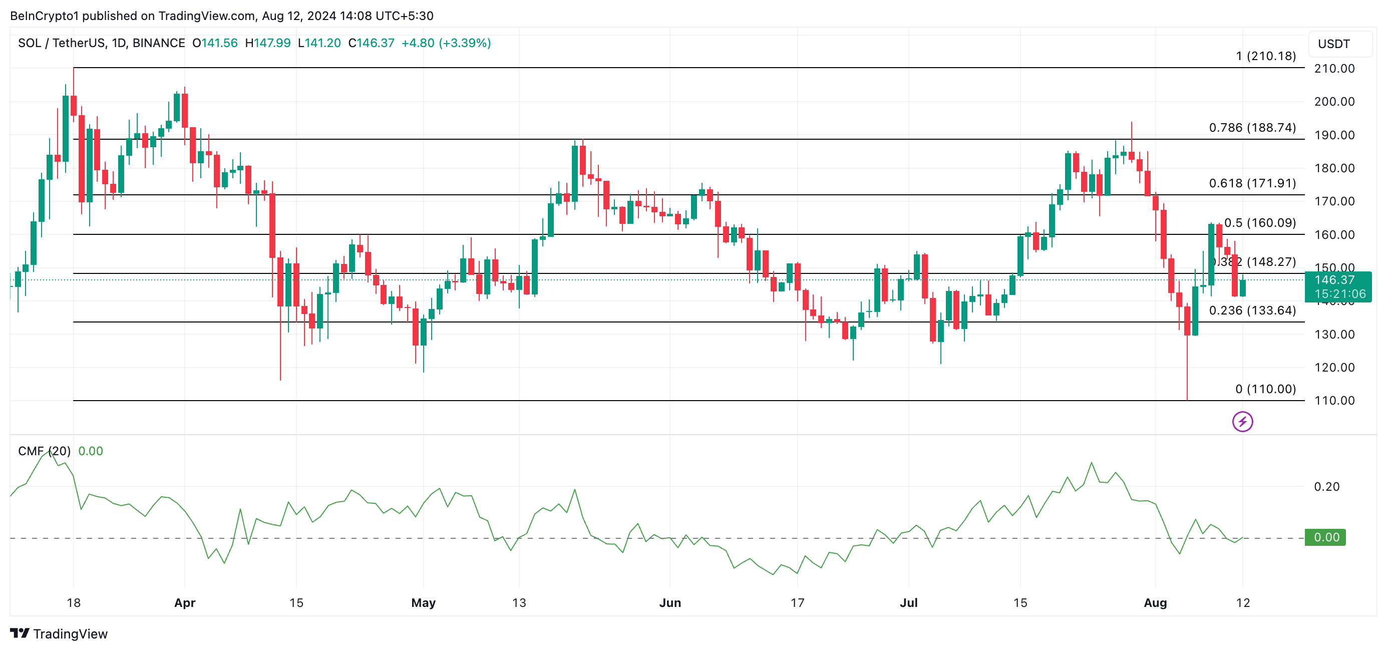تتداول عملة SOL بسعر 146.31 دولارًا في وقت النشر، مرتفعًا بنسبة 19٪ في الأيام السبعة الماضية. ومع ذلك، تشير قراءات مؤشر تدفق الأموال Chaikin Money Flow (CMF) إلى حالة من التردد في السوق حيث بدأ كل من المشترين والبائعين في الابتعاد عن التداول. وفي وقت النشر، استقر مؤشر CMF لعملة SOL على خط الوسط عند 0.