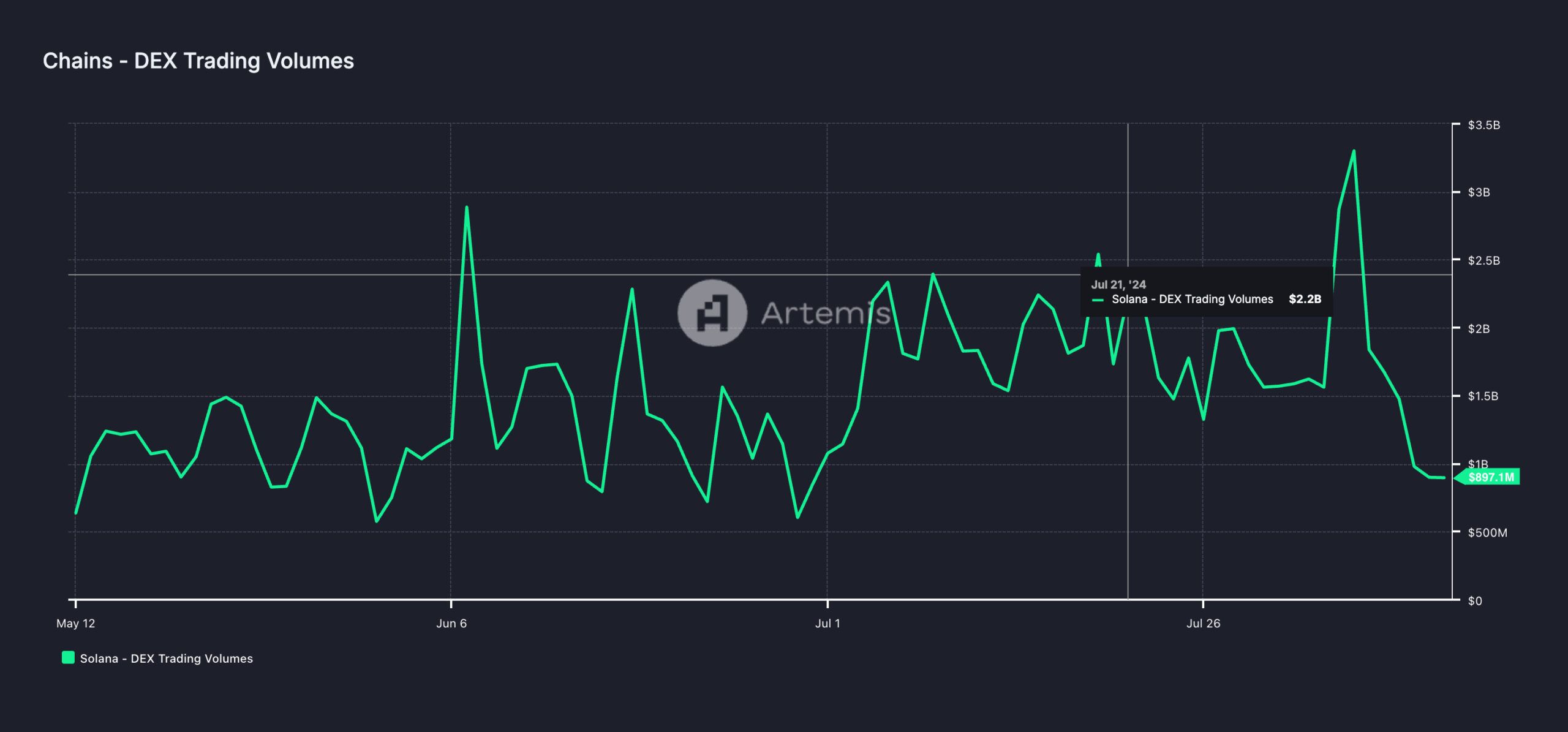 Sponsoredوفقًا لبيانات منصة Artemis، انخفض حجم التداول على منصات التداول اللامركزية DEX في سولانا بنسبة 72٪ في الأيام السبعة الماضية. وفي يوم الأحد، بلغ إجمالي حجم التداول 897 مليون دولار، مسجلًا أدنى حجم تداول يومي للشبكة منذ 30 يونيو.