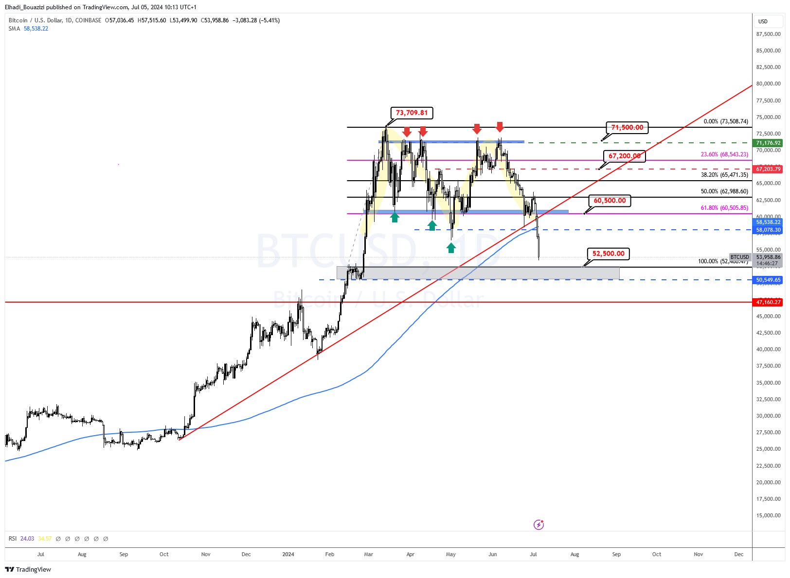 سعر بيتكوين BTC تمكن من كسر عدة مستويات دعم قوية جدا في يومين فقط، حيث بدأ بمستوى الدعم المحوري 60,500 دولار ن قبل أن يكمل يوم أمس على خط الاتجاه الهابط و المتوسط الحسابي 200 يوم.