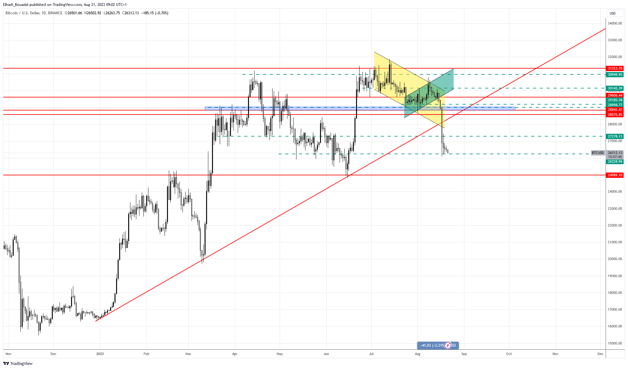 ويمكننا ملاحظة ذلك جليّا على الرسم البياني اليومي لسعر البيتكوين. إذا أن شمعة الهبوط الطويلة حدثت عندما كسر سعر البيتكوين BTC خط الاتجاه الصاعد، منذ بداية العام الجاري. والذي كان يمثل مستوى دعم متحرك قوي جدا.