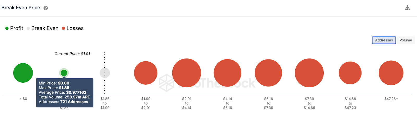 ومع ذلك، يمكن للمضاربين على الارتفاع محاولة القيام بمهمة انتعاش إذا ارتفع سعر عملة APE فوق 2.50 دولار. ولكن ستكون مهمة التغلب على المقاومة التي يمثلها 12000 مستثمر اشتروا العملة بمتوسط سعر 2.40 دولار شاقة.