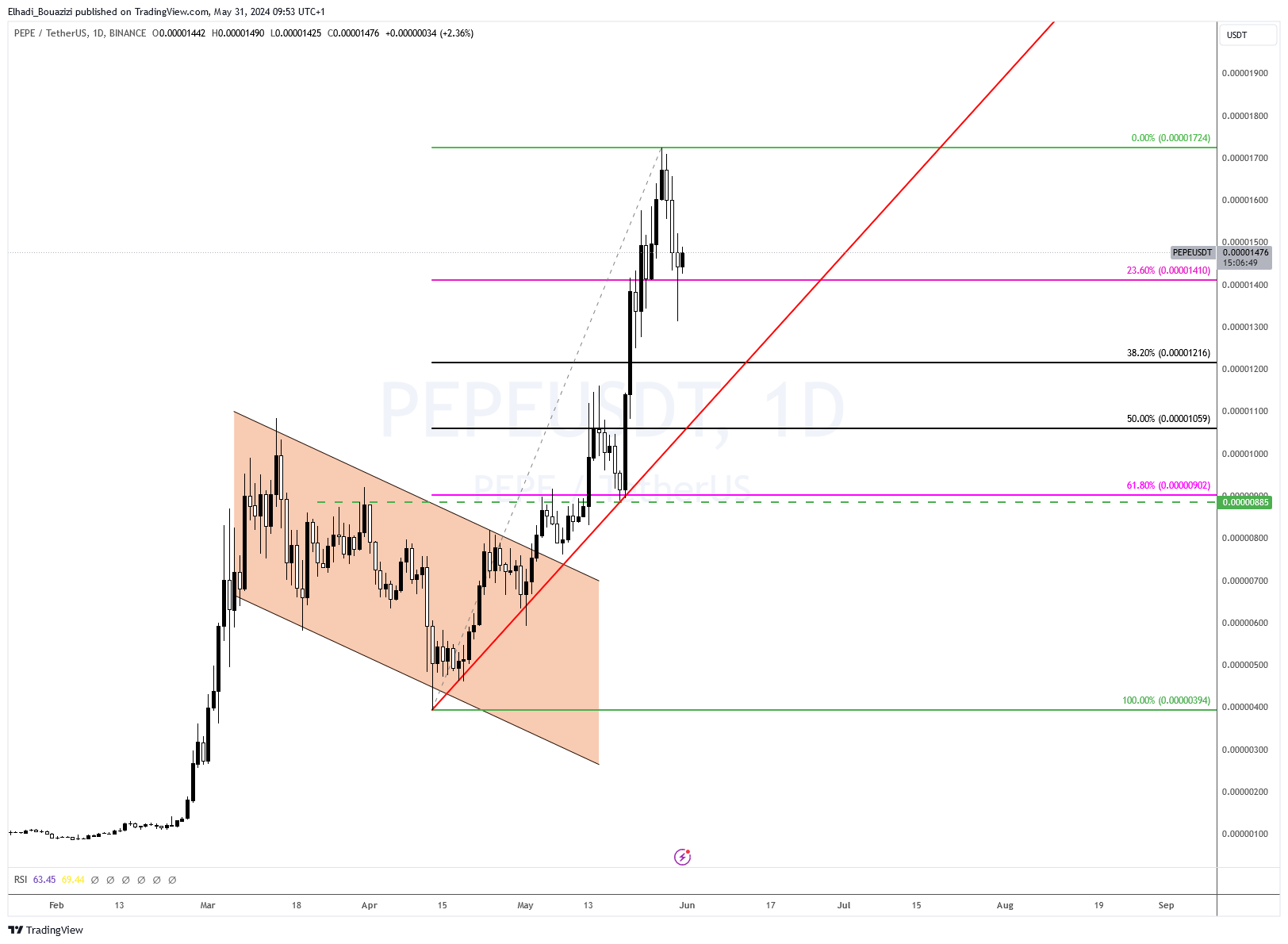 على الرغم من ارتفاع سعر PEPE بشكل كبير في شهر مايو، إلا أن العملة شهدت انخفاضاً ملحوظاً في الأيام الأخيرة من الشهر. بدأ الشهر عند سعر 0.0000061 دولار، وبحلول بداية هذا الأسبوع، تضاعفت قيمة العملة المشفرة تقريبًا ثلاث مرات لتتجاوز 0.0000170 دولار.