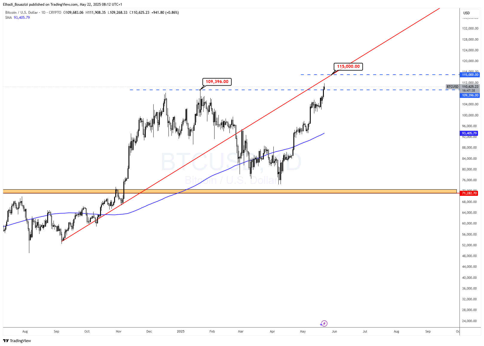 وسط موجة تفاؤل عارمة في أوساط المتداولين، واصلت بيتكوين BTC تسجيل مستويات تاريخية جديدة، لتتجاوز حاجز 111 ألف دولار خلال تعاملات الساعات الآسيوية.