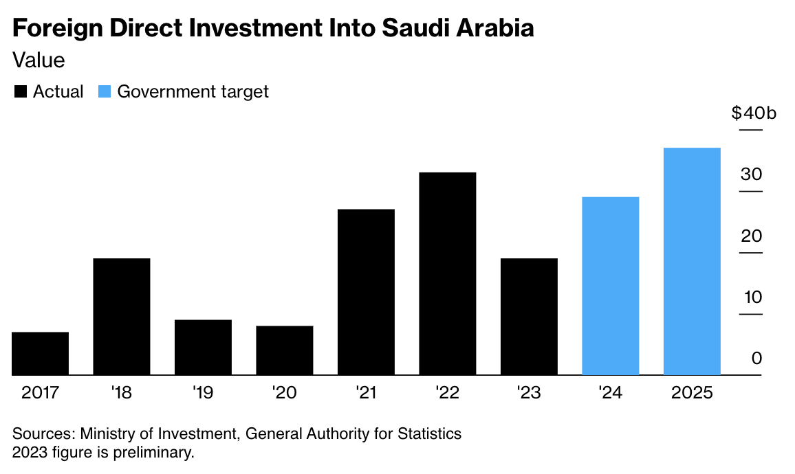هدف الحكومة للاستثمار الأجنبي المباشر في المملكة العربية السعودية. المصدر: بلومبرج