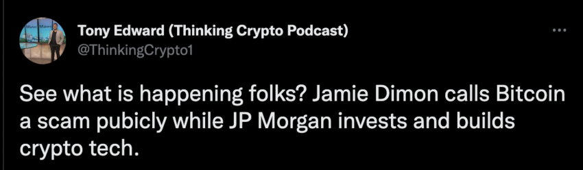 وقد يبدو التطور الجديد غريباً لدى خبراء التشفير، خاصة أن الرئيس التنفيذي للبنك جيمي ديمون، من أكبر ناقدي العملات المشفرة وفقاً لما ذكرته فوربس عن شهادته أمام الكونجرس وتصريحه بكونه من أكبر المشككين في هذه العملات، إضافة إلى وصفه لعملة البتكوين بأنها عبارة عن مخططات بونزي المزيفة في صورة لامركزية.
