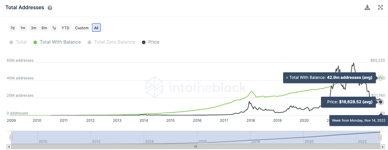 وليست البنوك فقط من تتبني التشفير فقط تظهر سلاسل الكتل ايضا هذا الأمر، فبحسب بيانات منصة IntoTheBlock فإن إجمالي عناوين البتكوين ذات اللون الأخضر في ارتفاع مستمر منذ وجودها إضافة إلى وجود 43 مليون محفظة بيتكوين تحتوي على رصيد.