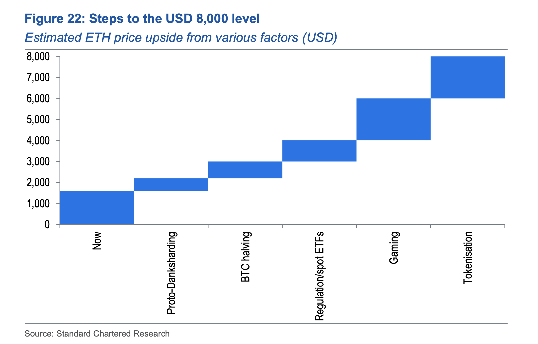 يُعتبر توقع وصول سعر ايثيريوم ETH إلى 8000 دولار خطوة أولية على الطريق نحو تحقيق النطاق الذي حدده البنك سابقًا كـ "التقييم الهيكلي طويل الأمد" والذي يتراوح بين 26000 و35000 دولار، وفقًا لما ذكره كيندريك.