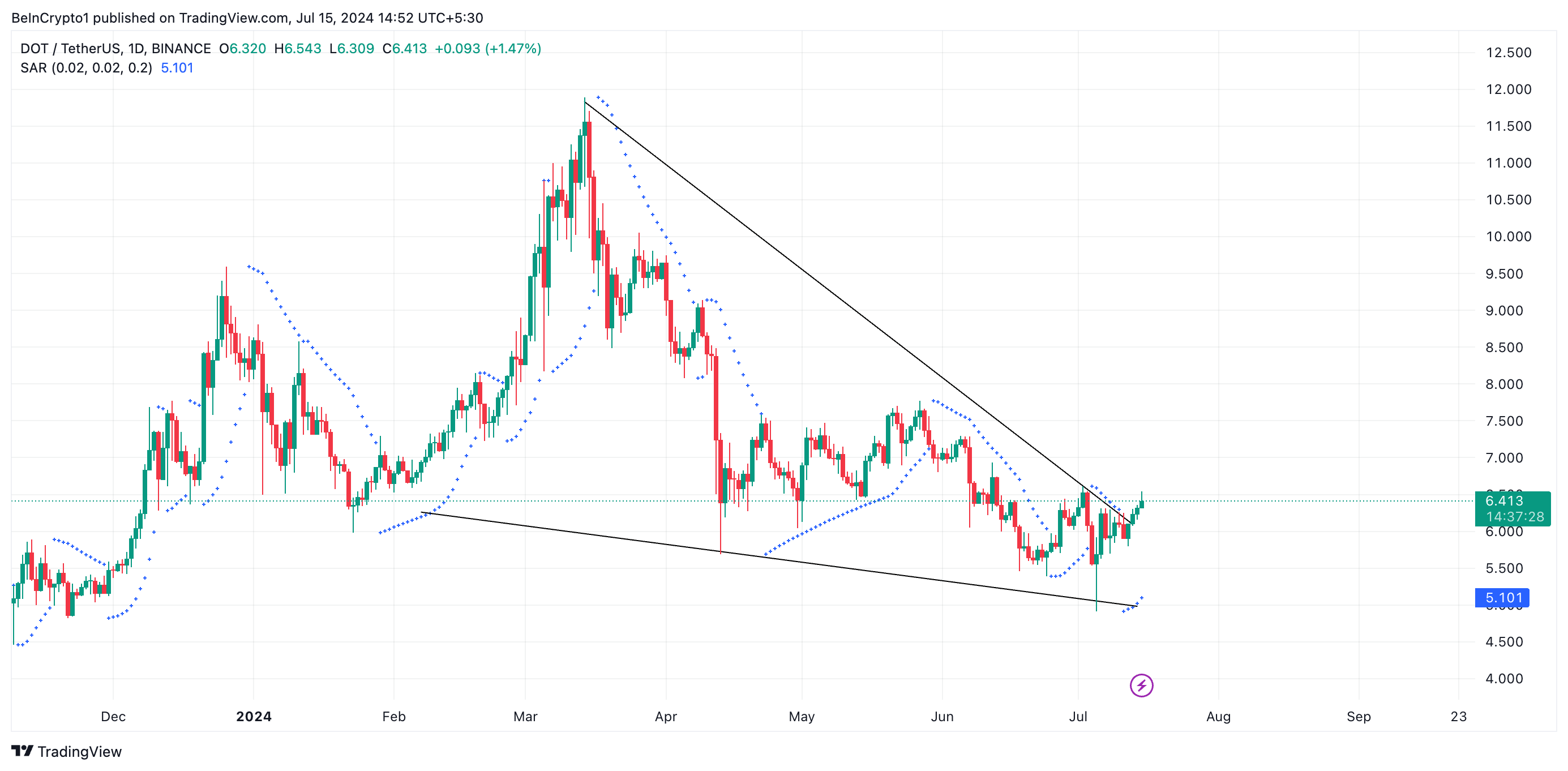 تزايد التحيز الصعودي تجاه DOT منذ 11 يوليو. يمكن استنتاج ذلك من إعداد مؤشر الوقف والعكس البارابولي (SAR) الملاحظ في مخطط يومي.