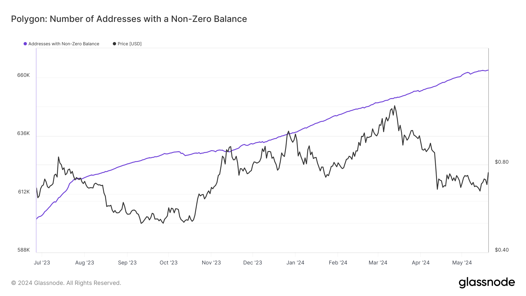 يزداد عدد عناوين MATIC ذات الرصيد غير الصفري بشكل مطرد، مما يشير إلى نمو قوي للشبكة واعتمادها.