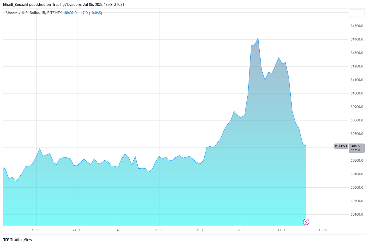 وفور صدور هذه البيانات تراجعت أسعار البيتكوين بنسبة 0.21%. على الرسم البياني 15 دقيقة لتتداول عند مستوى 30555 دولار بعد أن كانت بلغت قميه 31150 دولار قبل ساعات. كما انخفض سعر إيثيريوم بنسبة 0.52% إلى 1898 دولار.