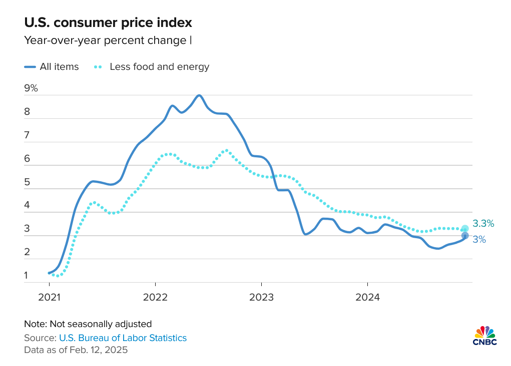 أظهرت بيانات التضخم الأمريكية ارتفاع مؤشر أسعار المستهلك بنسبة 0.5% خلال يناير، متجاوزًا التوقعات التي كانت عند 0.3%، في حين سجل المؤشر الأساسي، الذي يستثني أسعار الغذاء والطاقة، زيادة بنسبة 0.4% مقابل توقعات بـ 0.3%. وعلى أساس سنوي، ارتفع التضخم إلى 3% متجاوزًا التقديرات البالغة 2.9%، بينما ارتفع المؤشر الأساسي إلى 3.3% مقارنة بالتوقعات التي بلغت 3.1%.