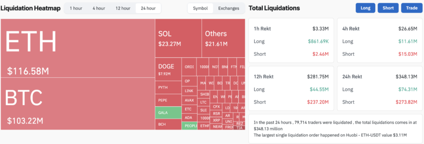 تكشف بيانات من Coinglass أن 79714 متداولا واجهوا غضب التصفية خلال ال 24 ساعة الماضية، حيث بلغ إجمالي عمليات التصفية 348.13 مليون دولار. على وجه التحديد، شهدت الصفقات القصيرة تصفية بقيمة 273.82 مليون دولار، بينما شهدت الصفقات الطويلة تصفية بقيمة 74.31 مليون دولار.