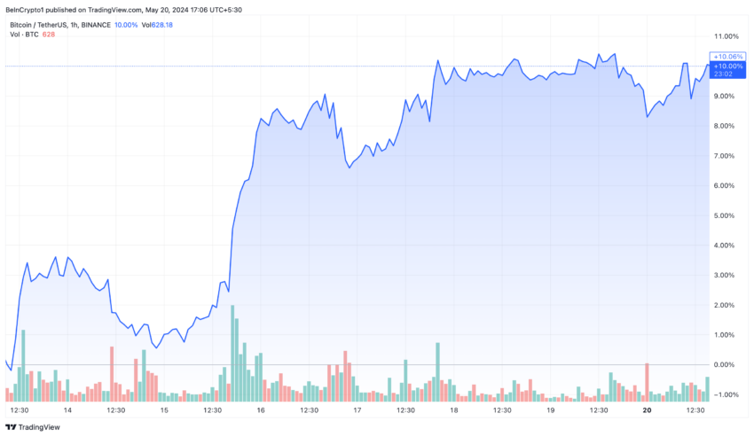 Sponsoredأغلقت عملة البيتكوين الأسبوع عند حوالي 66300 دولار، بزيادة تزيد عن 10٪ منذ 13 مايو. حدثت معظم الزيادة في الأسعار يوم الأربعاء، بينما أظهرت بقية الأسبوع حركة سعر مستقرة نسبيا.