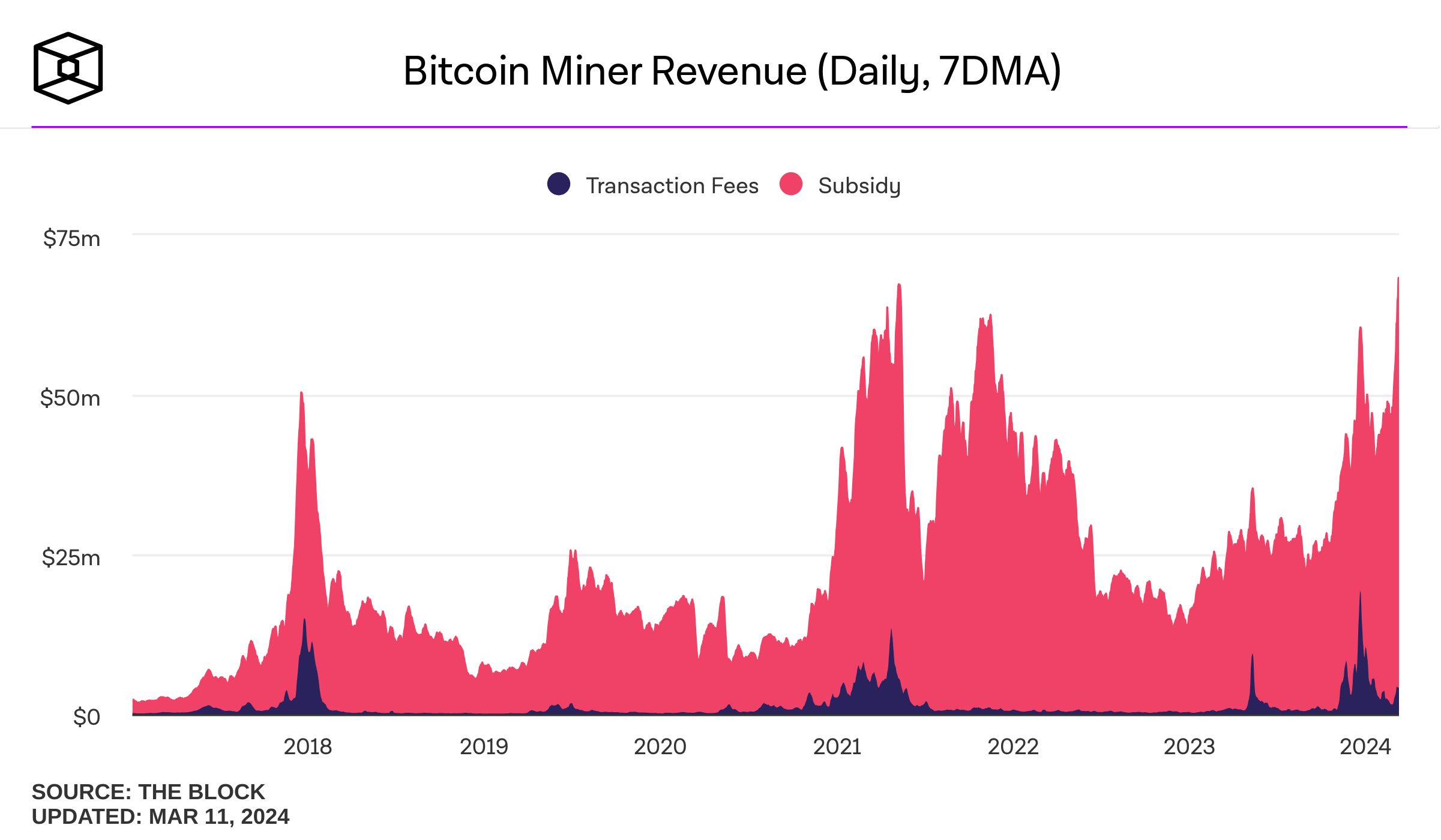 بلغت إيرادات عمال تعدين بيتكوين ذروتها الأسبوع الماضي، متجاوزةً الرقم القياسي المسجل في أبريل 2021 خلال فترة الارتفاع الكبيرة السابقة لسوق العملات المشفرة. ووفقًا لبيانات من شركة CryptoQuant ، وصل إجمالي الدخل اليومي إلى 78.6 مليون دولار أمريكي في 7 مارس.