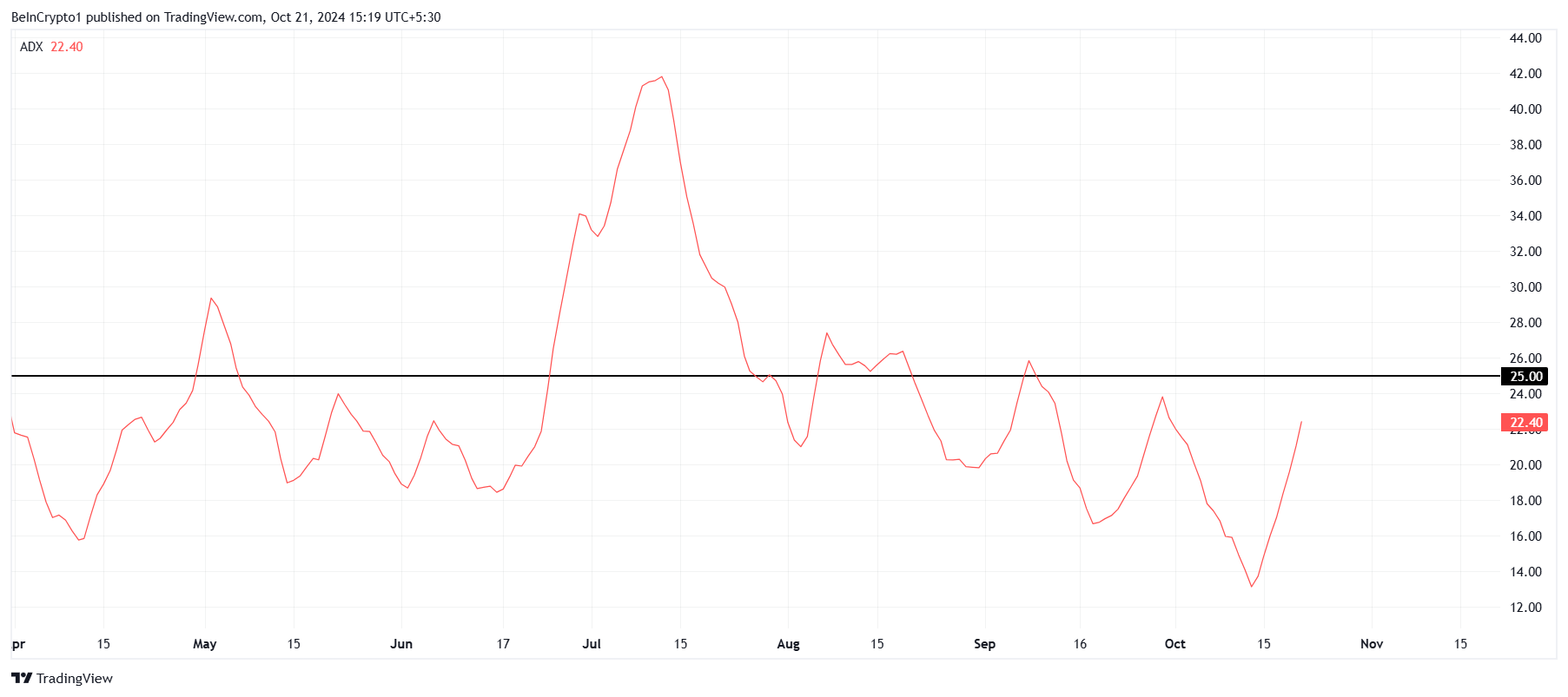 من منظور فني، يظل الزخم الكلي لبيتكوين قويًا. أحد المؤشرات الرئيسية التي تدعم هذه الرواية الصعودية هو مؤشر الاتجاه العام (ADX)، والذي يقترب من عتبة حاسمة تبلغ 25,0.