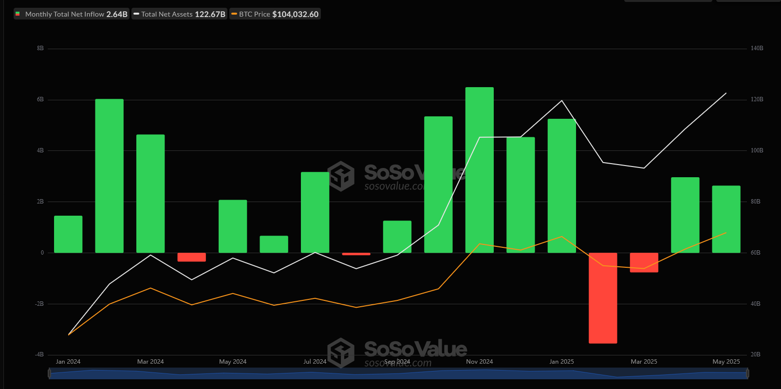 وجاء هذا الارتفاع في سياق تدفّقات استثمارية قوية نحو صناديق ETF بيتكوين الفورية في الولايات المتحدة، التي تجاوزت 2.8 مليار دولار خلال النصف الأول من مايو، وفق بيانات SoSoValue، فيما ارتفع إجمالي الأصول تحت الإدارة إلى أكثر من 122 مليار دولار.