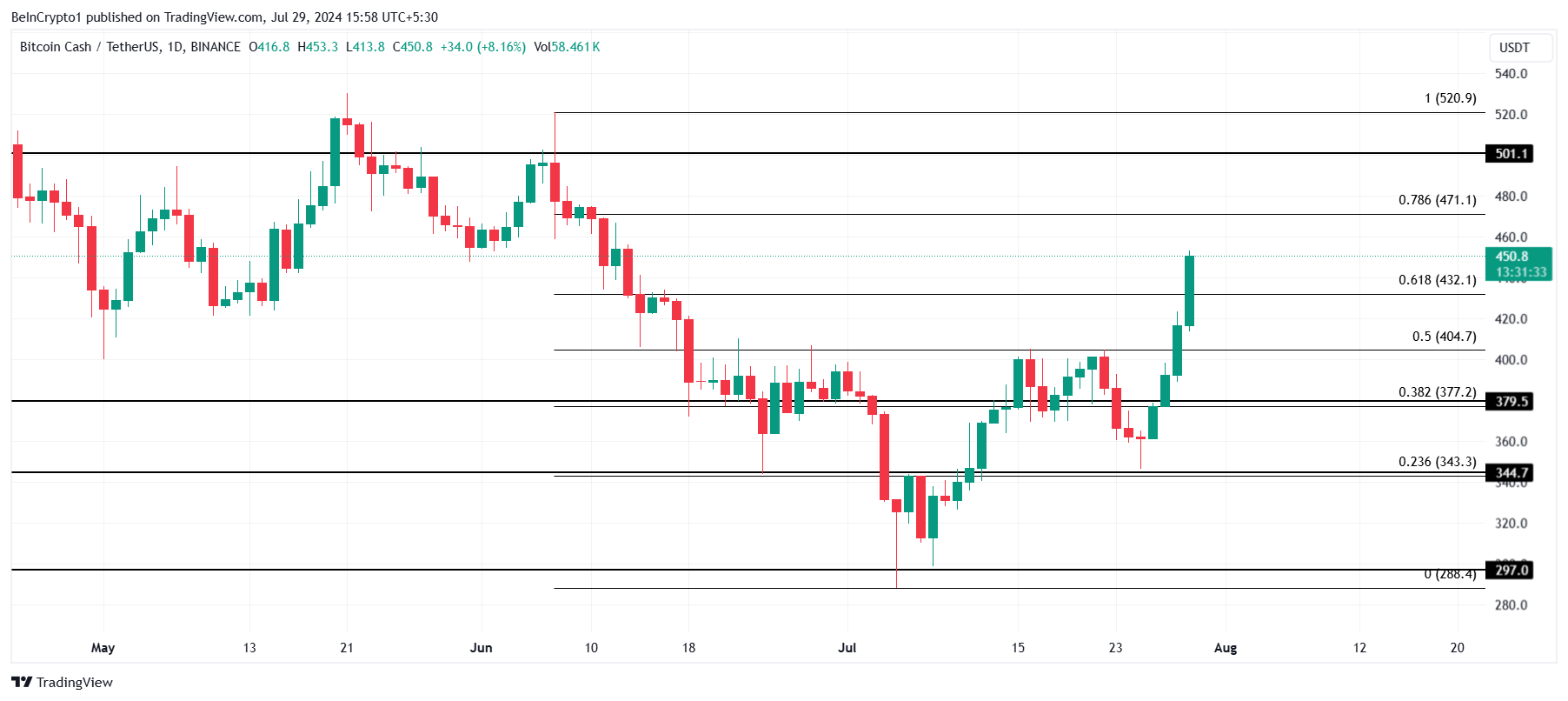 ارتفع سعر BCH 25% في الأيام الأربعة الماضية، ويتم تداوله حالياً عند 450$. العملة البديلة قريبة من اختراق خط فيبوناتشي 78,6%، الذي يعمل كمقاومة عند 471$. ومع ذلك، ستوقف العوامل المذكورة أعلاه ذلك.